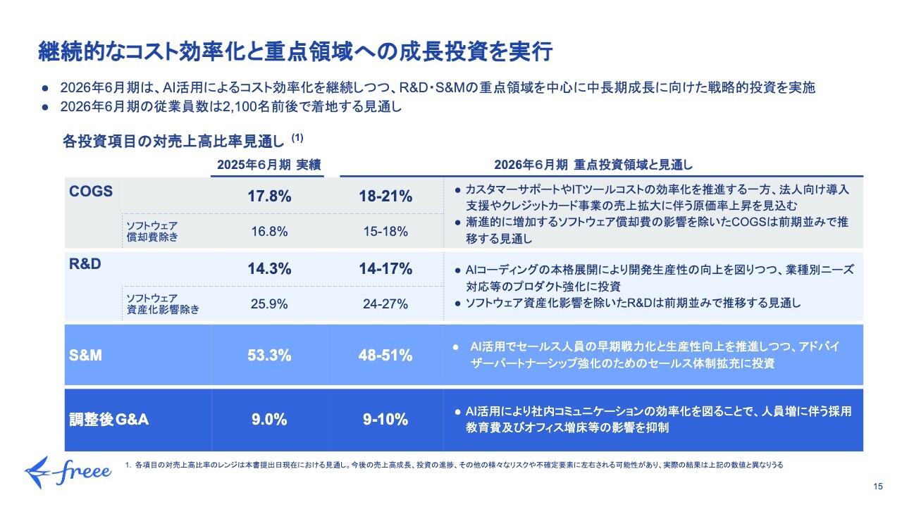 また、クレジットカード事業についてはSaaSと比較するとどうしても原価率が高く、事業の成長に伴い原価自体も増加する見込みです。ただし、これらの原価増については、AIを活用した他部門での生産性向上やコスト削減等により、相殺していく方針です。