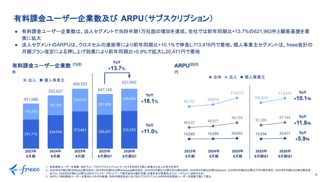 有料課金ユーザー企業数は、法人セグメントで四半期に1万社を超える増加を達成しました。全セグメントの合計は62万1,963社となり、前年同期比13.7パーセント成長しました。