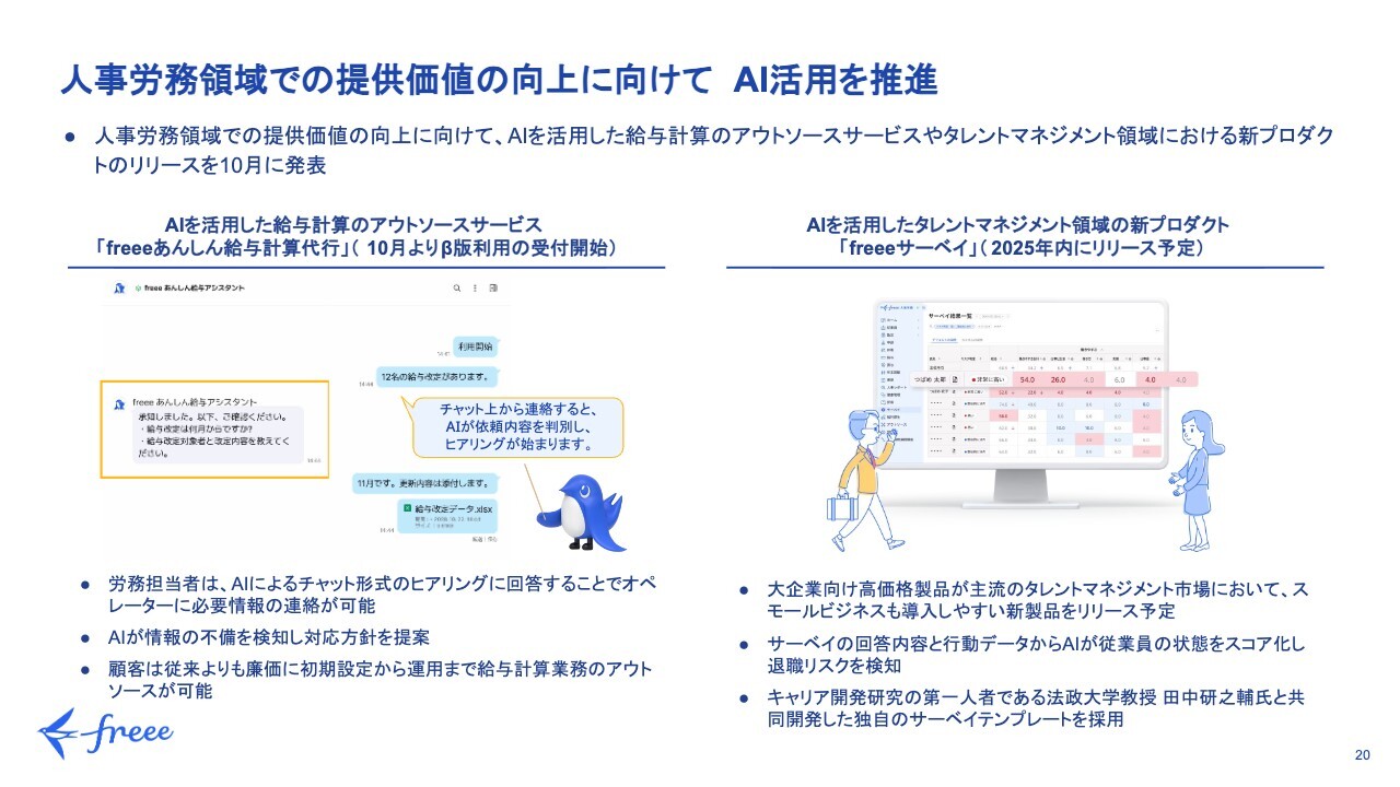 次に、スライド右側に記載しているのは、AIを活用したタレントマネジメント領域の新プロダクト「freeeサーベイ」です。こちらはすでにリリース間近となっています。