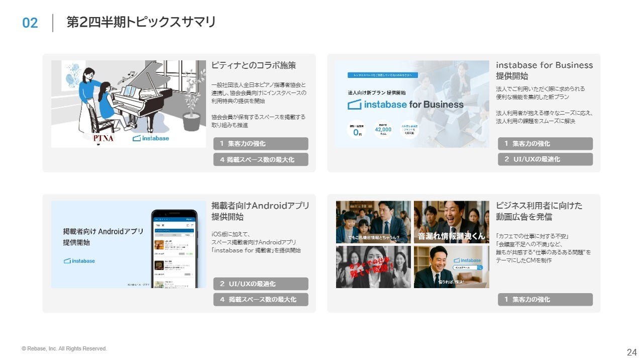 当社では「インスタベース」の成長戦略に基づいた取り組みを進めています。第2四半期においては、アライアンスやマーケティング施策を活用し、集客力の強化に注力しました。
