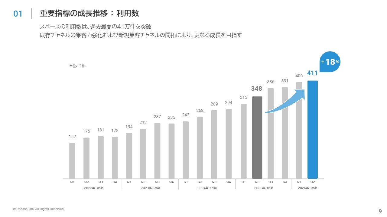 各指標について詳しくご説明します。利用数については、第2四半期は41万1,000件のスペース利用があり、引き続き過去最高を更新しています。