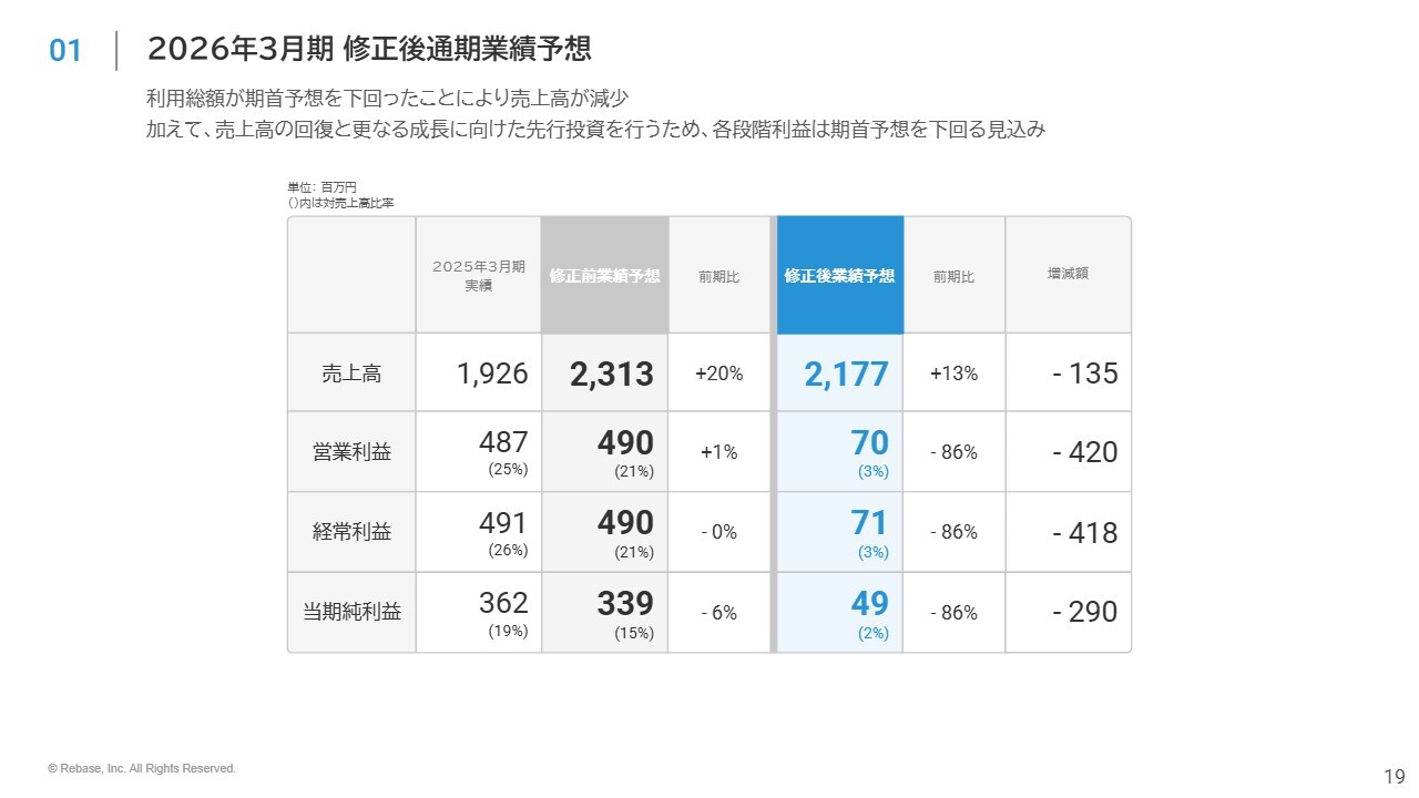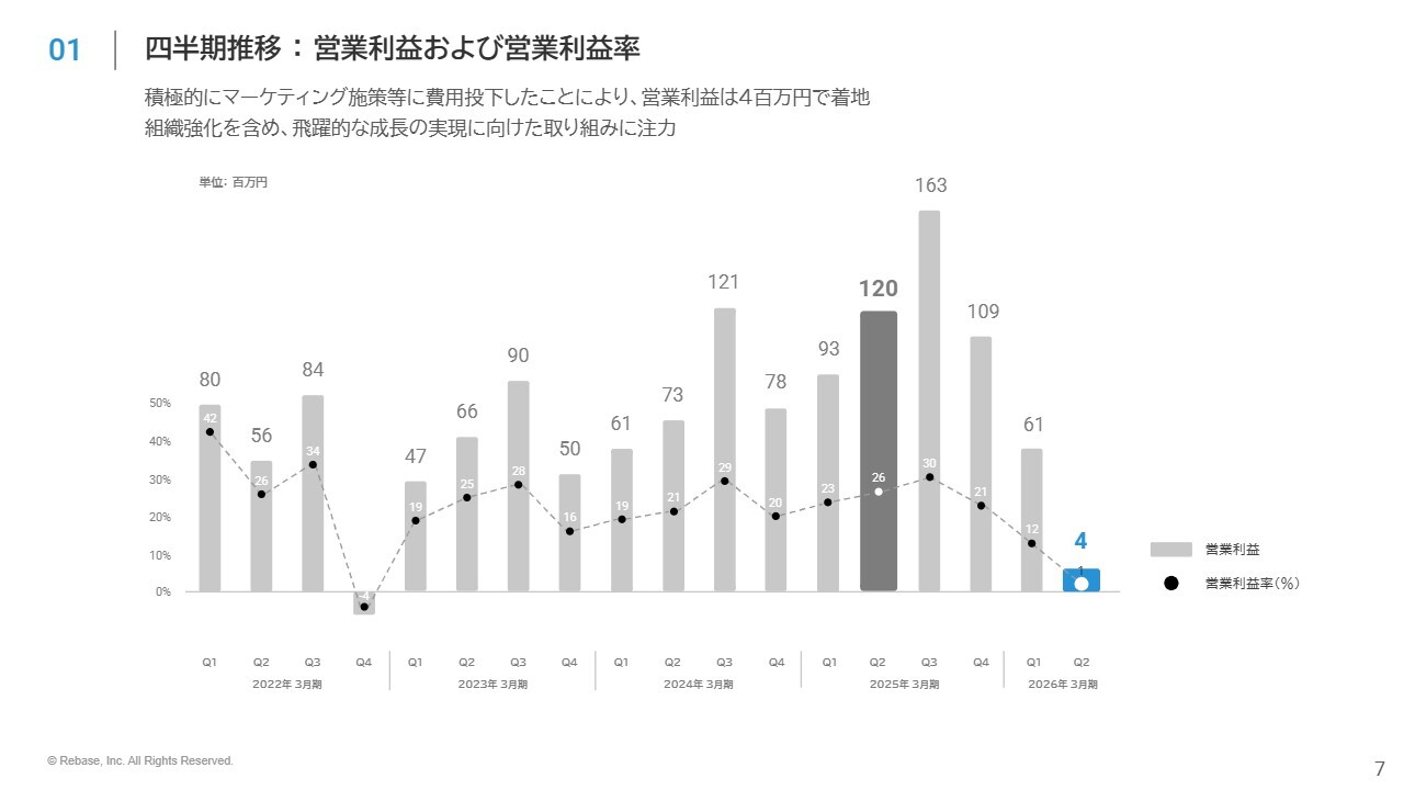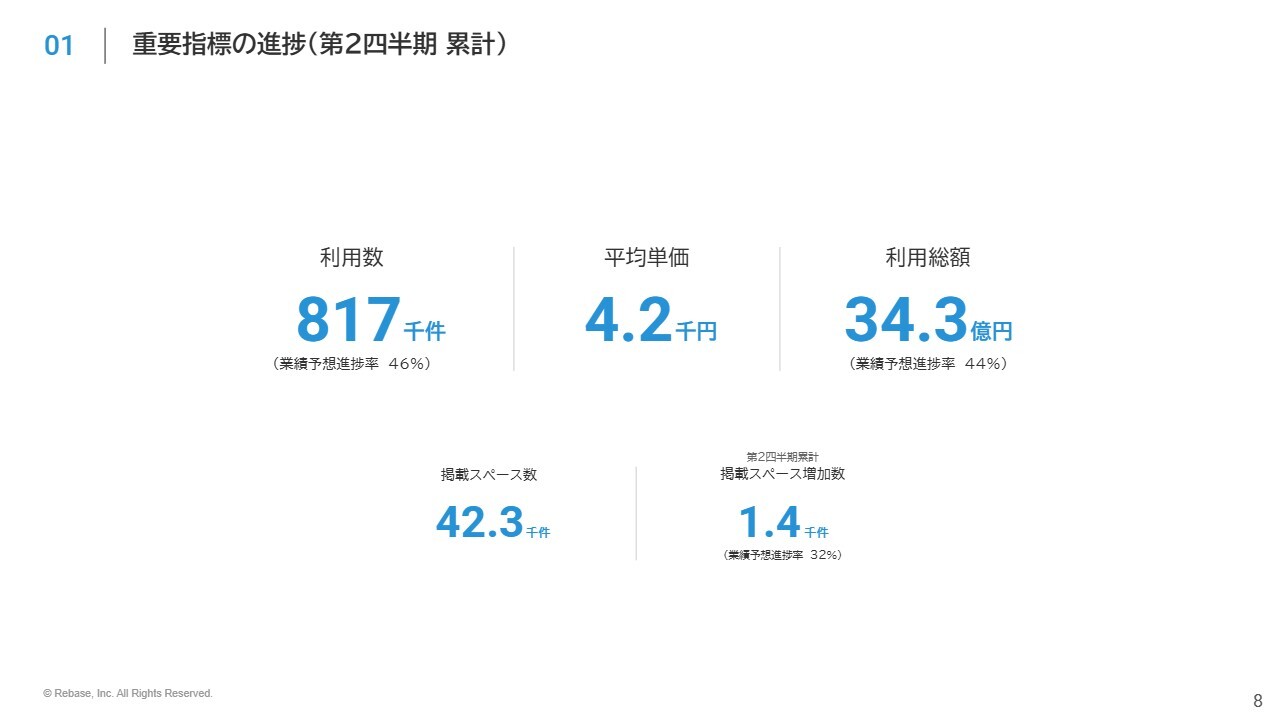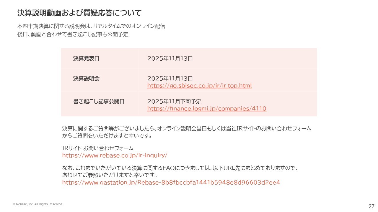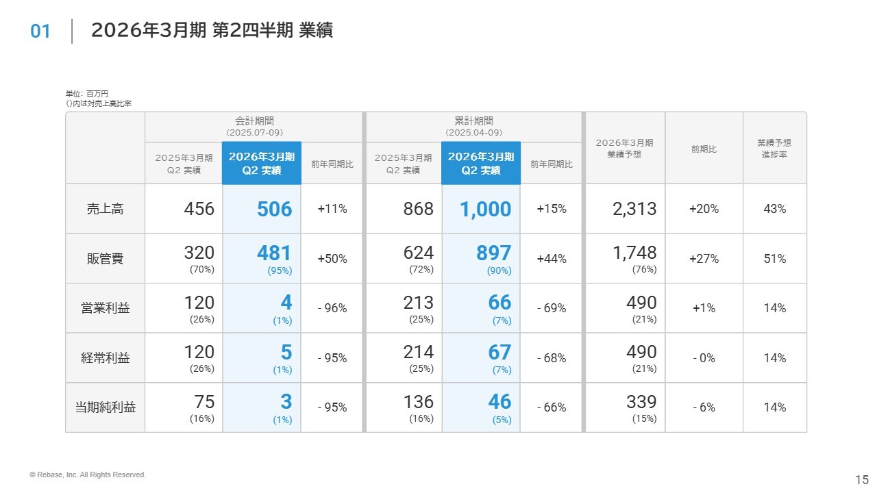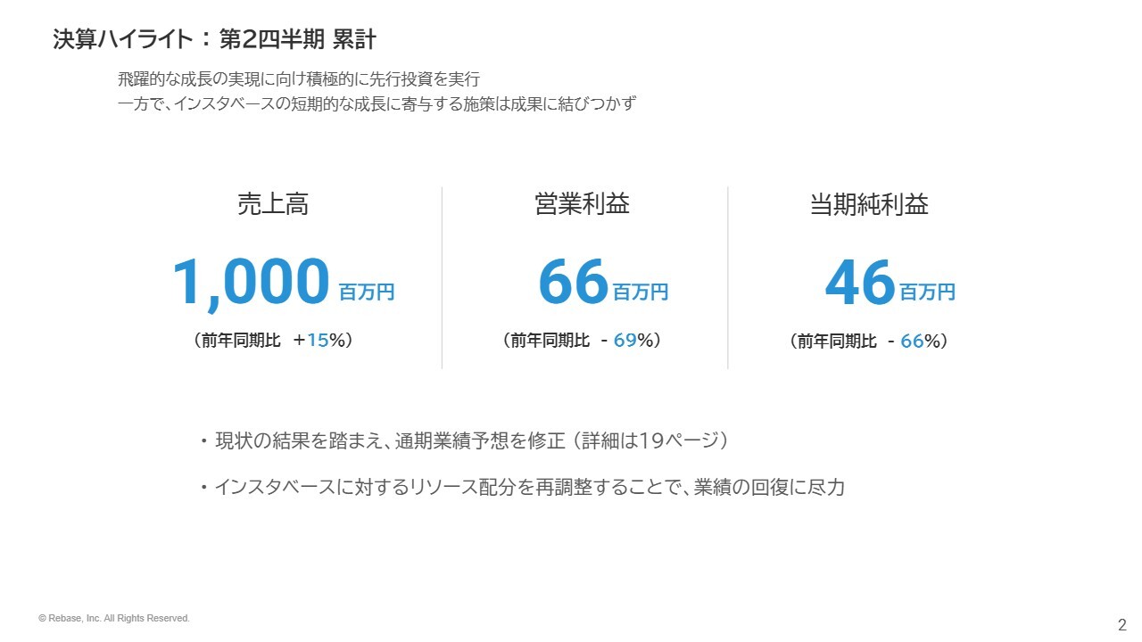 第2四半期については、みなさまの期待に応えられた業績ではなかったと認識しています。投資家や株主のみなさまのご期待に応えられるよう、下半期も全力で邁進していく考えです。引き続きRebaseをご支援いただけますよう、よろしくお願いします。