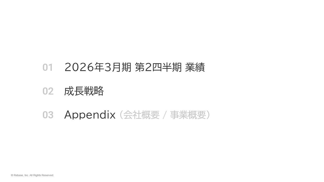 佐藤海氏:株式会社Rebase代表取締役の佐藤海です。当社の2026年3月期第2四半期決算説明をご視聴いただき、誠にありがとうございます。この時間を通じて当社についてのご認識とご理解を深めていただければと思いますので、どうぞよろしくお願いします。