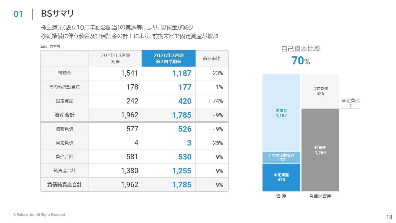 BSサマリです。株主還元の実施等により、前期末比で現預金が減少しています。また、移転準備に伴う敷金及び保証金の計上により、前期末比で固定資産が増加しています。