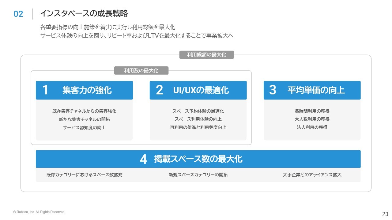 「インスタベース」の成長戦略です。さらなる「インスタベース」の成長に向けて、集客力の強化、UI/UXの最適化、平均単価の向上、掲載スペースの最大化の4つに、これまでどおり注力していきます。