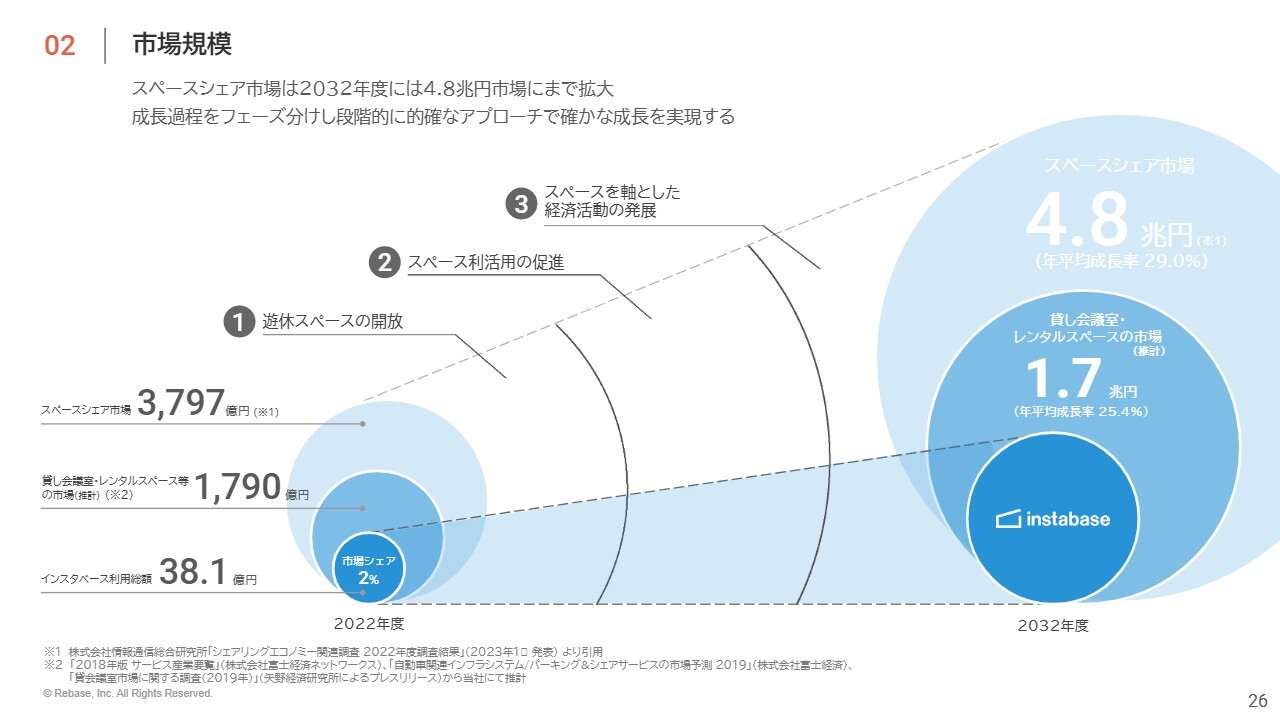 最後に、市場規模についてご説明します。「インスタベース」が属するスペースシェア市場では、場所の需要と供給の両側面から今後も飛躍的な成長が見込まれます。