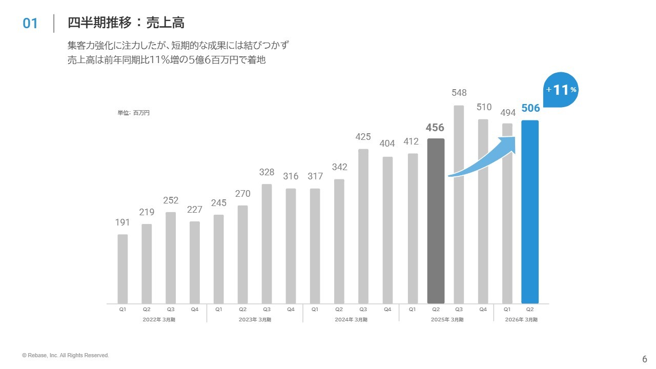 四半期別売上高の推移です。2026年3月期第2四半期では、マーケティング施策をはじめとした集客力強化に注力したものの、短期的な成果には結びつかず、前年同期比11パーセント増の5億600万円で着地しました。