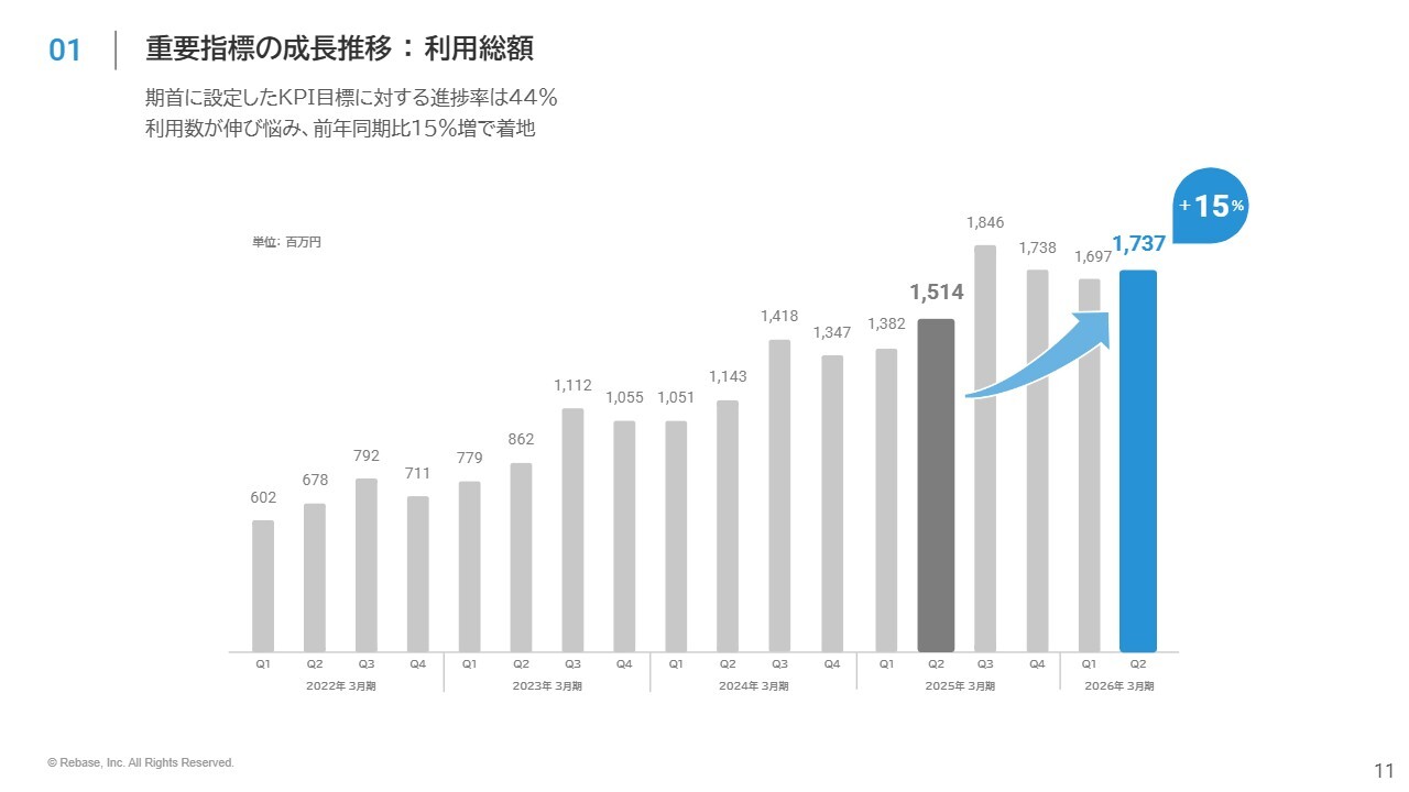 最重要指標である利用総額は、利用数が伸び悩んだことにより、前年同期比15パーセント増で着地しました。期首に設定したKPI目標に対する進捗率は44パーセントとなっています。