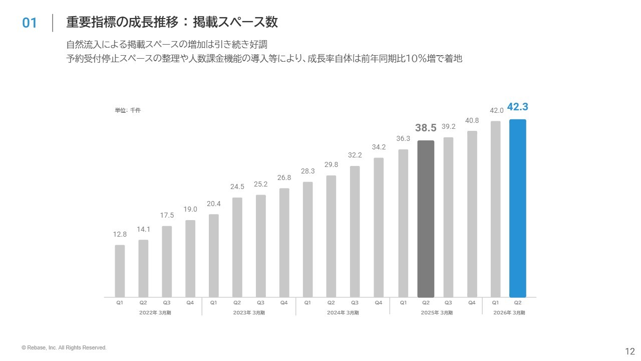 自然流入による掲載スペースの増加は引き続き好調です。第2四半期では、予約受付を停止したスペースの整理や、掲載者による人数課金機能の導入等により、成長率自体は前年同期比10パーセント増での着地となりました。