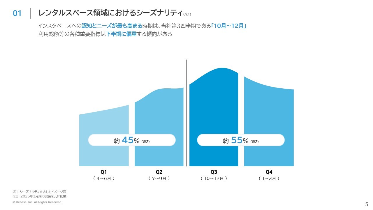 レンタルスペース市場は成長市場であることに加え、第3四半期(10月から12月)がレンタルスペースに対する認知とニーズが最も高まる時期です。そのため、上半期よりも下半期に売上が偏重する傾向があります。