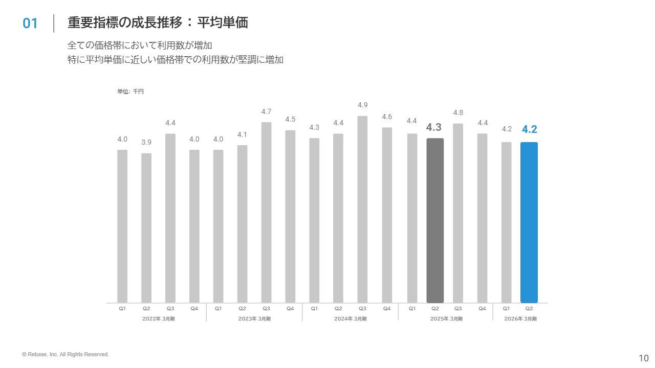 平均単価については、すべての価格帯で利用数が増加しています。特に、平均単価に近い価格帯での利用数が堅調に増加しているため、平均単価は前年同期比で横ばいとなっています。