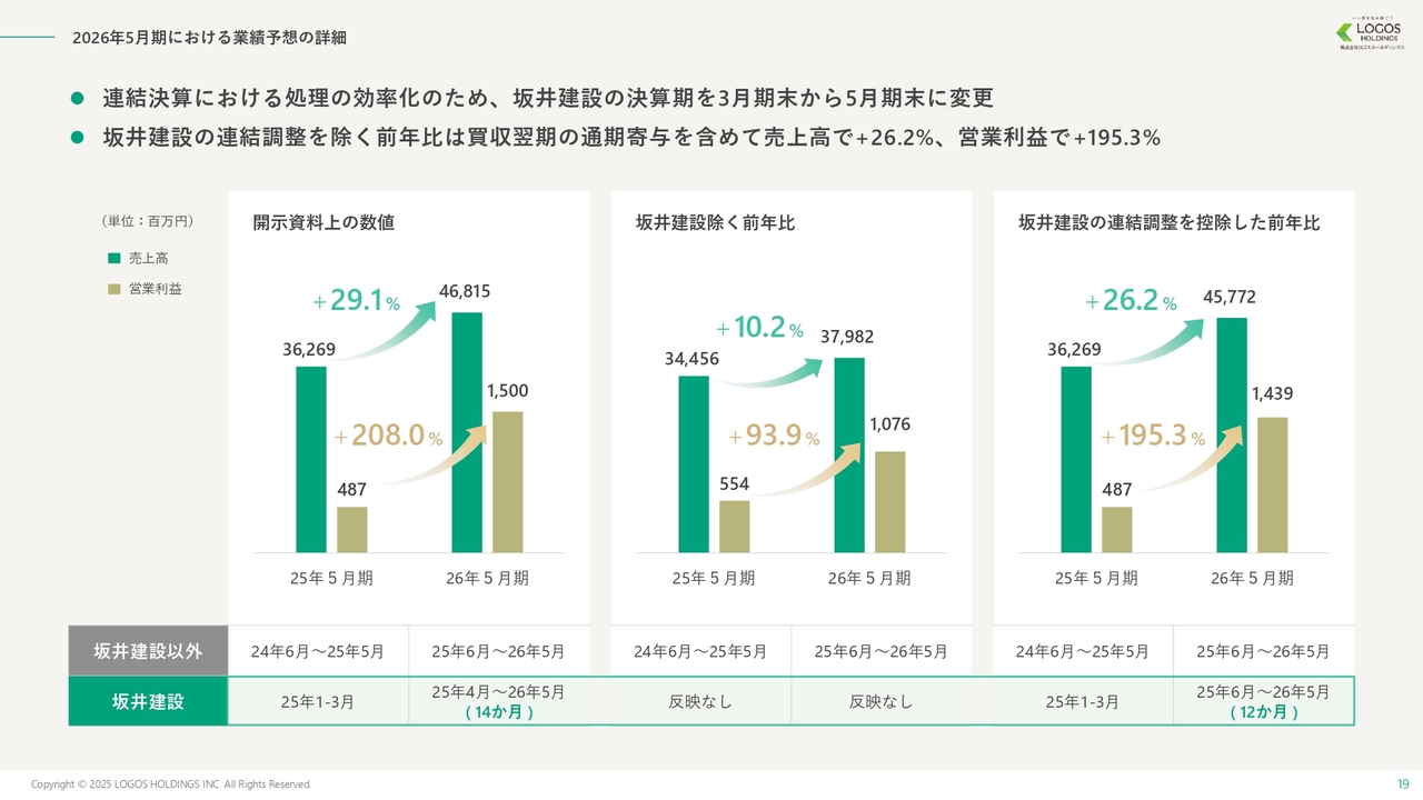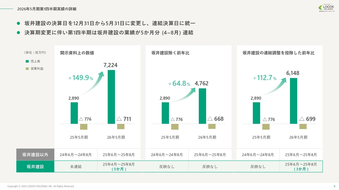 なお、2026年5月期第1四半期では、坂井建設の決算期変更に伴う連結調整があります。詳細は次のスライドでご説明します。
