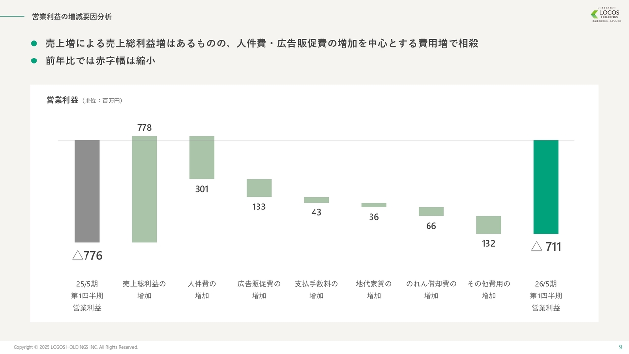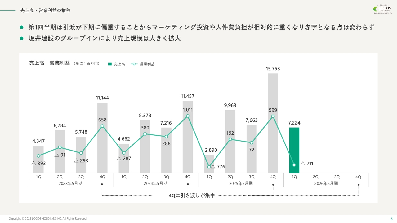 営業利益は、引渡棟数が前年から大幅に増加したものの、坂井建設のM&Aや新規出店に伴う販管費の増加、および売上の季節偏重の影響を受け、第1四半期は営業損失7億1,100万円となりました。