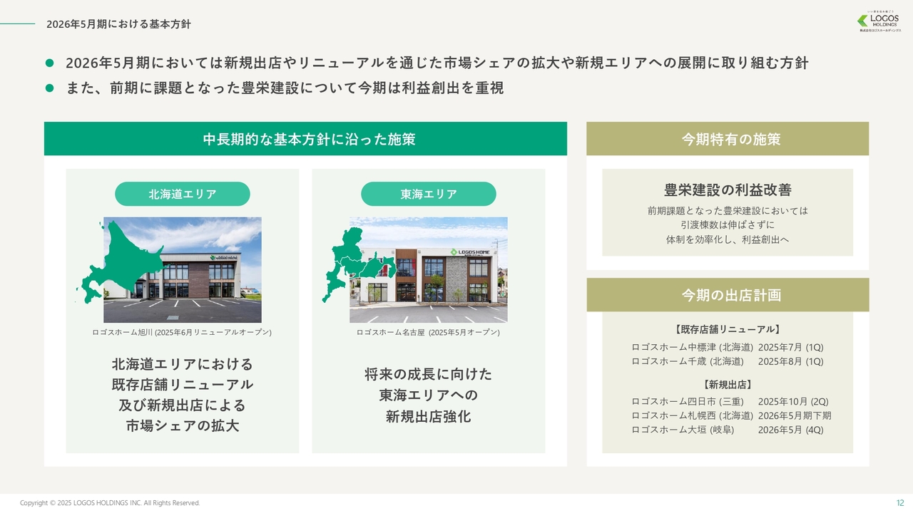 北海道エリア以外では、新規出店によるエリア拡大を引き続き推進していきます。5月末に「ロゴスホーム名古屋」をオープンしたことで東海エリアへ、昨年度末の坂井建設のグループインにより北陸エリアへの進出を果たしました。今期は、岐阜・三重での新規出店を通じて、東海エリアのさらなる拡大を図っていきます。