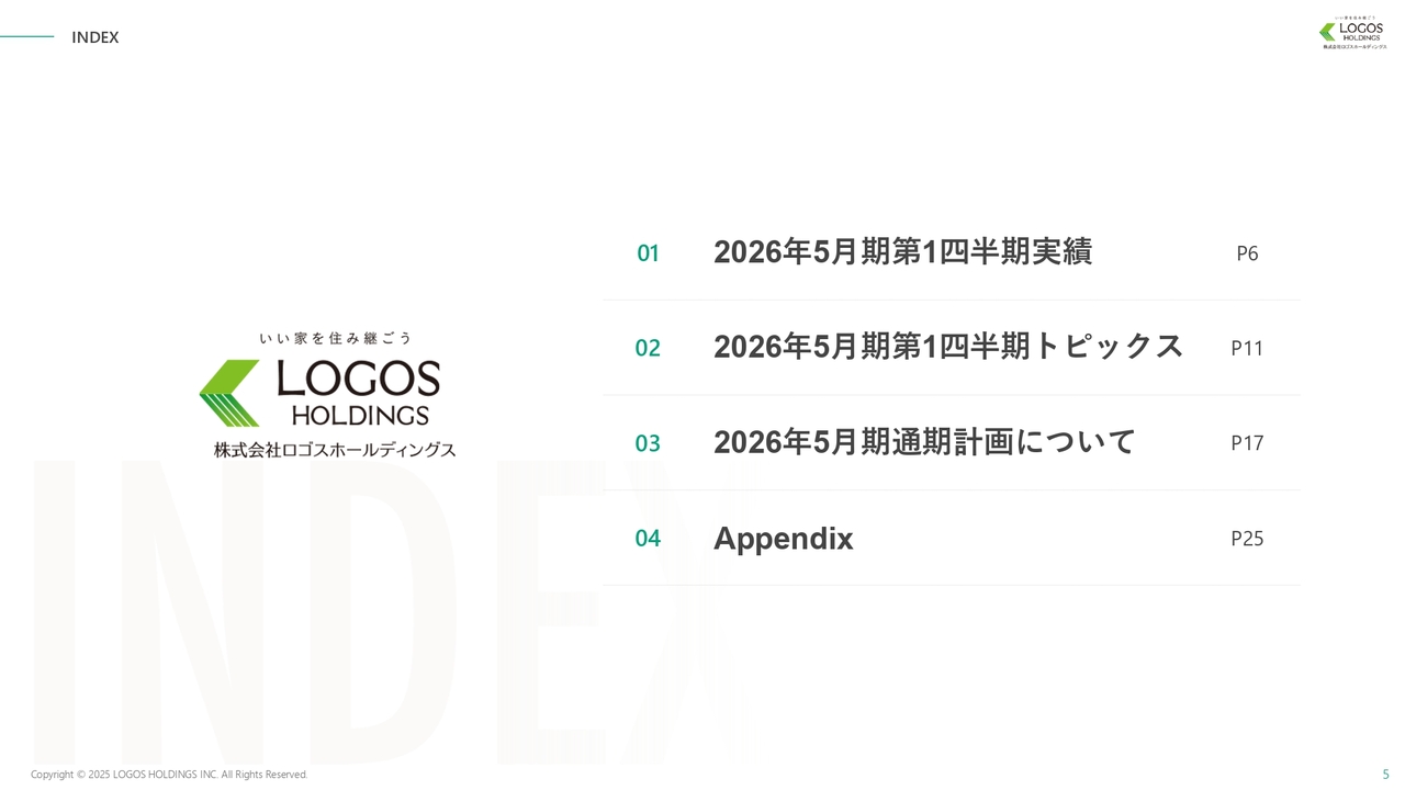 池田雄一氏(以下、池田):みなさま、本日はお集まりいただき、誠にありがとうございます。株式会社ロゴスホールディングス代表取締役社長の池田雄一です。本日は、2026年5月期第1四半期の決算概要と今後の見通しについて、詳しくお話しします。