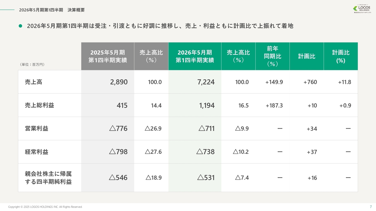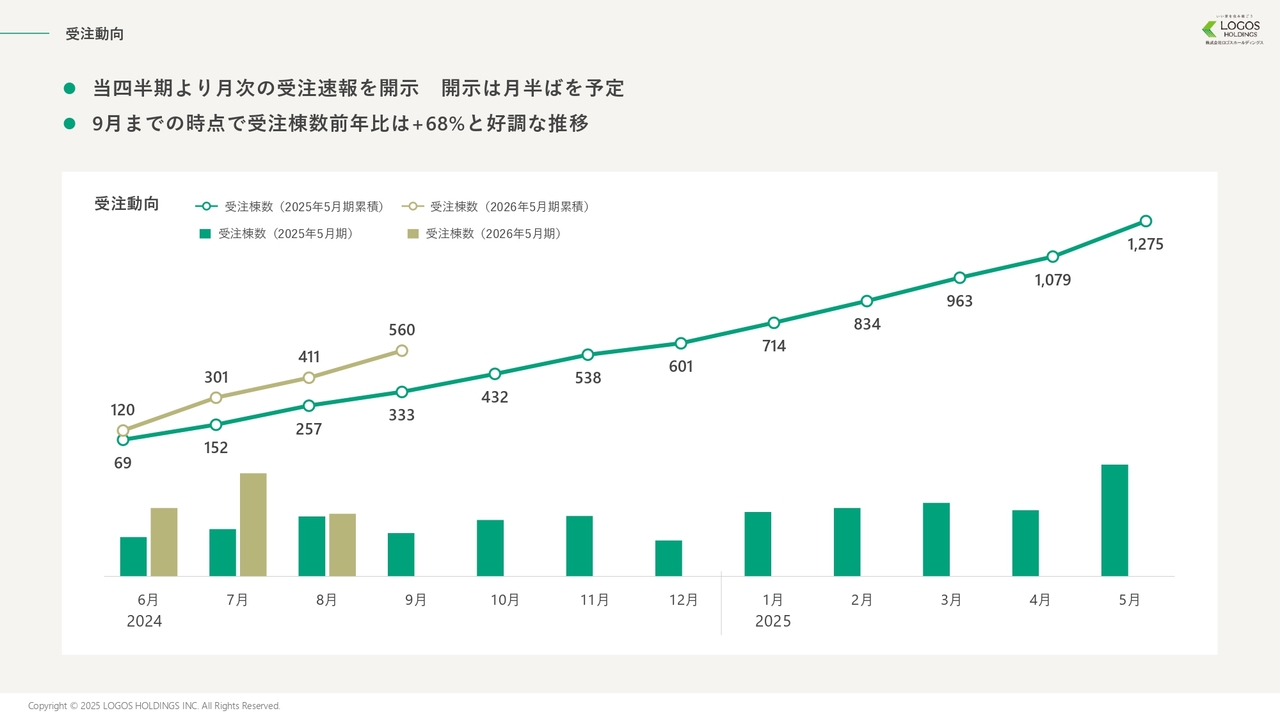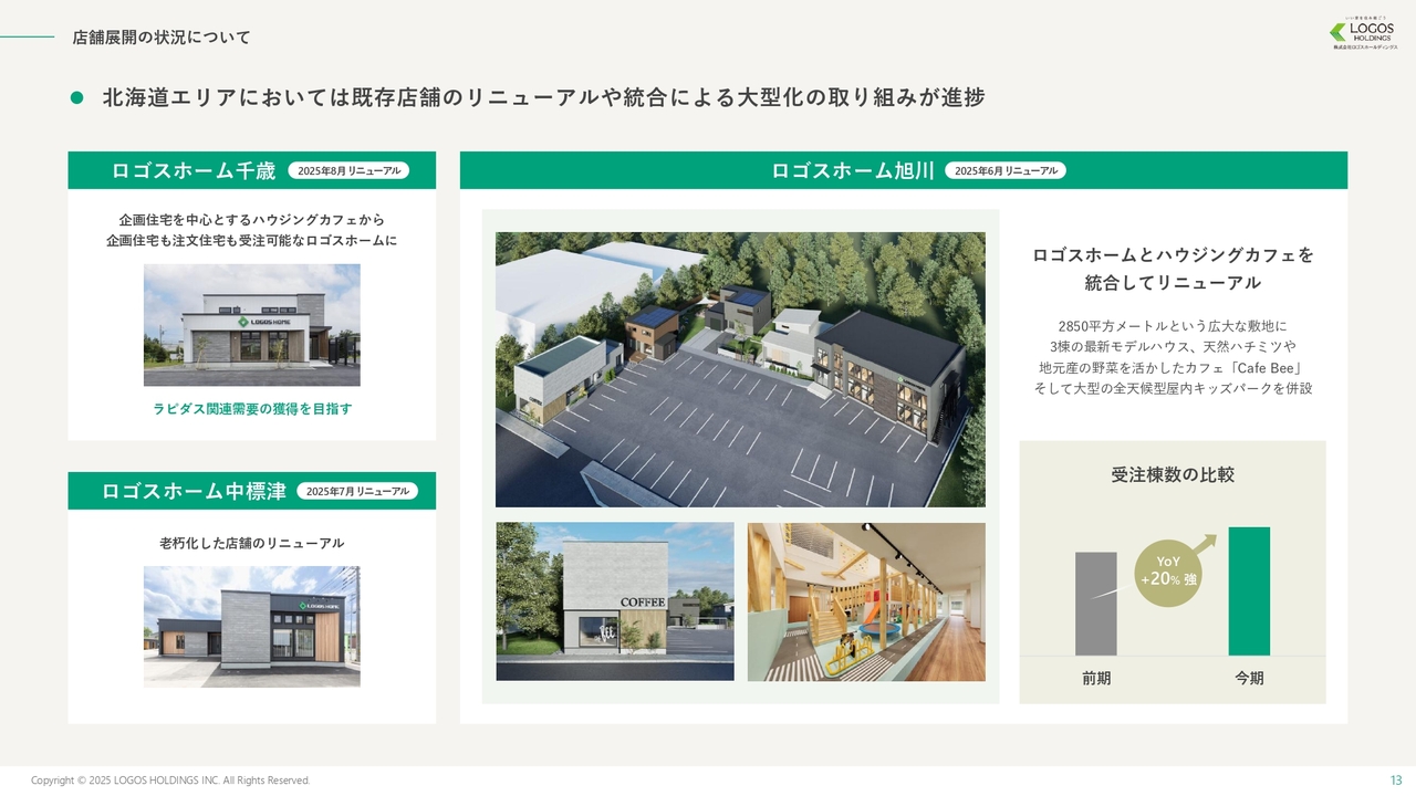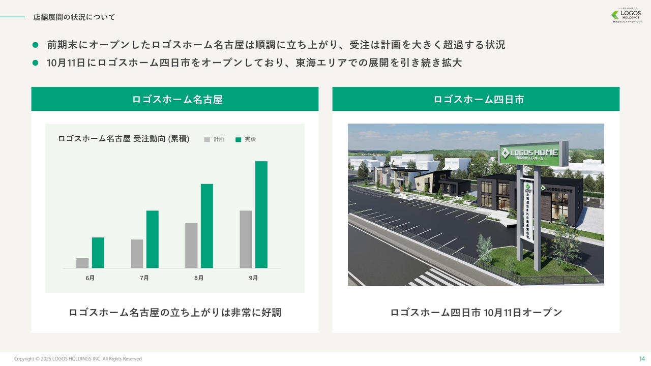 特に、「ロゴスホーム旭川」は2025年6月に大型の自社展示場としてリニューアルしました。「ロゴスホーム旭川」については、前期の第1四半期の受注も堅調でしたが、リニューアル後には前年同期比で20パーセント以上伸長しています。第2四半期以降もさらなる受注の伸びを期待しています。