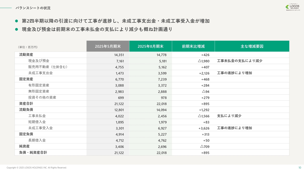 前期末から工事の進捗が進んだ結果、現金及び預金、未成工事支出金、工事未払金、未成工事受入金などが増減していますが、計画どおりに推移していると認識しています。