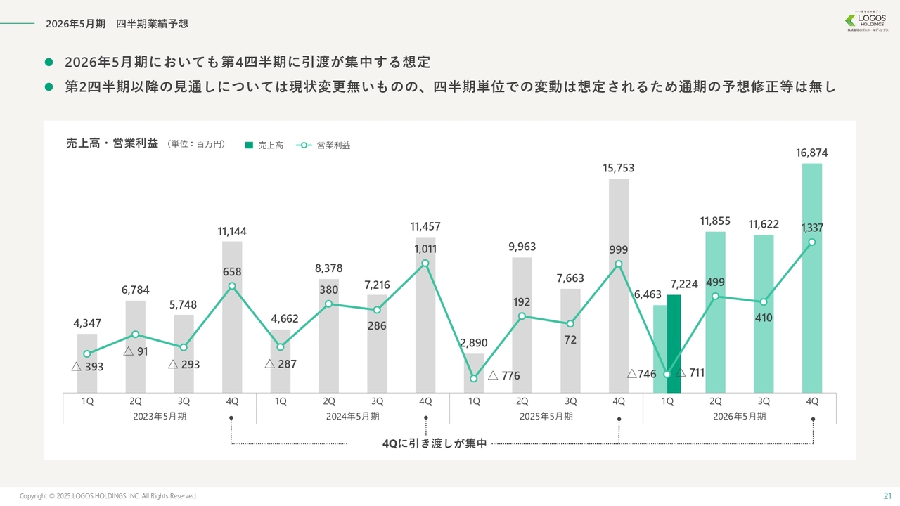 2026年5月期の四半期業績予想についてです。第1四半期は計画を上回る結果となりましたが、2026年5月期も前期同様に第4四半期に引渡が集中し、売上の季節偏重が強い見通しです。