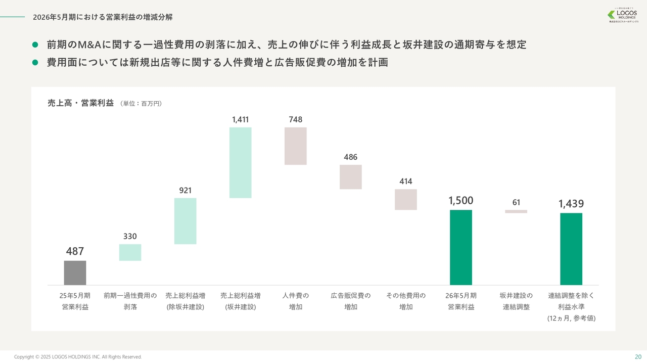 前期のM&Aによる一過性の影響がなくなったことに加え、坂井建設の売上の通期寄与やロゴスホームのエリア拡大、既存エリアのシェア拡大に伴う棟数増加で得られた粗利により、坂井建設のグループインを含めた規模拡大による人件費や広告販促費などの費用増加をカバーできたため、大幅な増益が見込まれています。