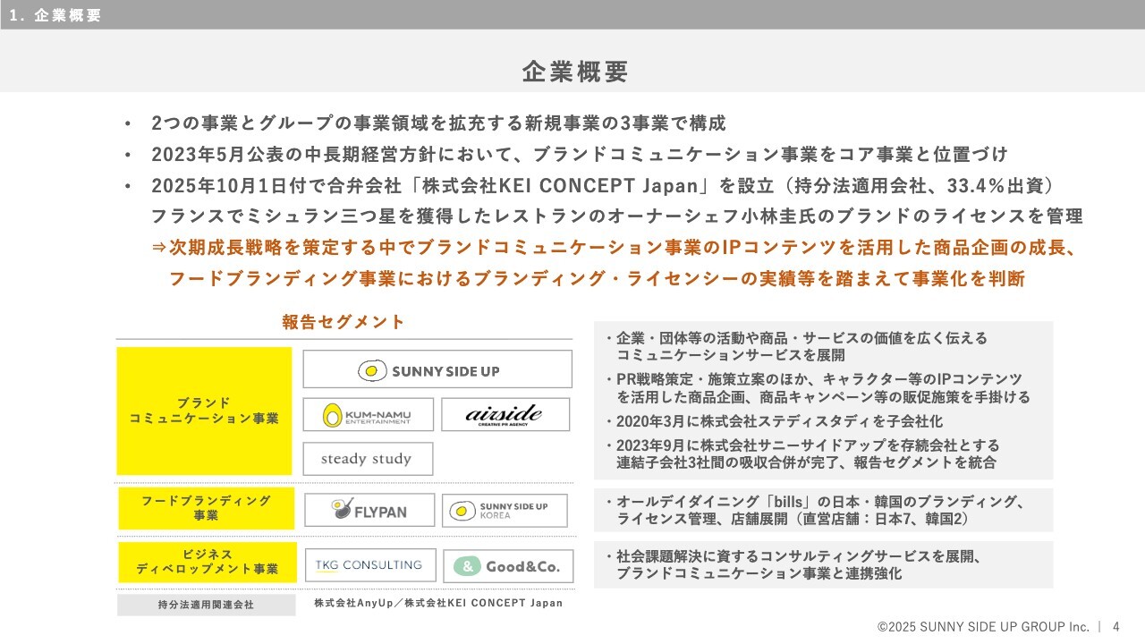 なお、2025年10月1日付で合弁会社「株式会社KEI CONCEPT Japan」を設立し、持分法適用会社としました。資本金1,000万円で、当社の出資比率は33.4パーセントです。こちらは、フランスでミシュラン三つ星を獲得したレストランのオーナーシェフ小林圭氏のブランドのライセンスを管理する企業です。