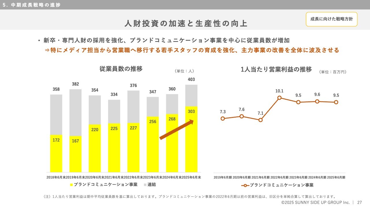 特にサニーサイドアップでは、入社後にメディアリレーションを担当し、営業職に移行することが多いため、若手スタッフを対象とした営業職移行者育成プログラムを進めています。これらの取組みが事業全体に波及し、1人当たりの営業利益の改善につながることを期待しています。