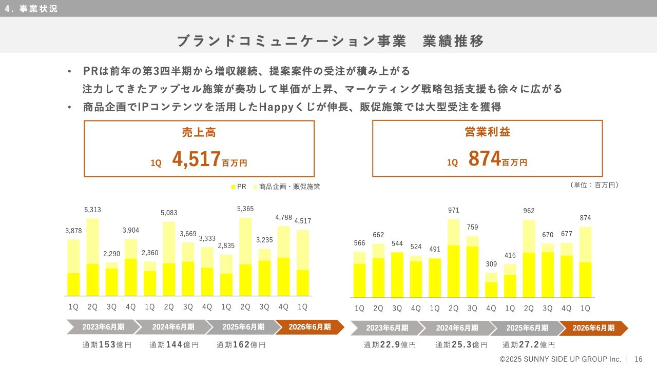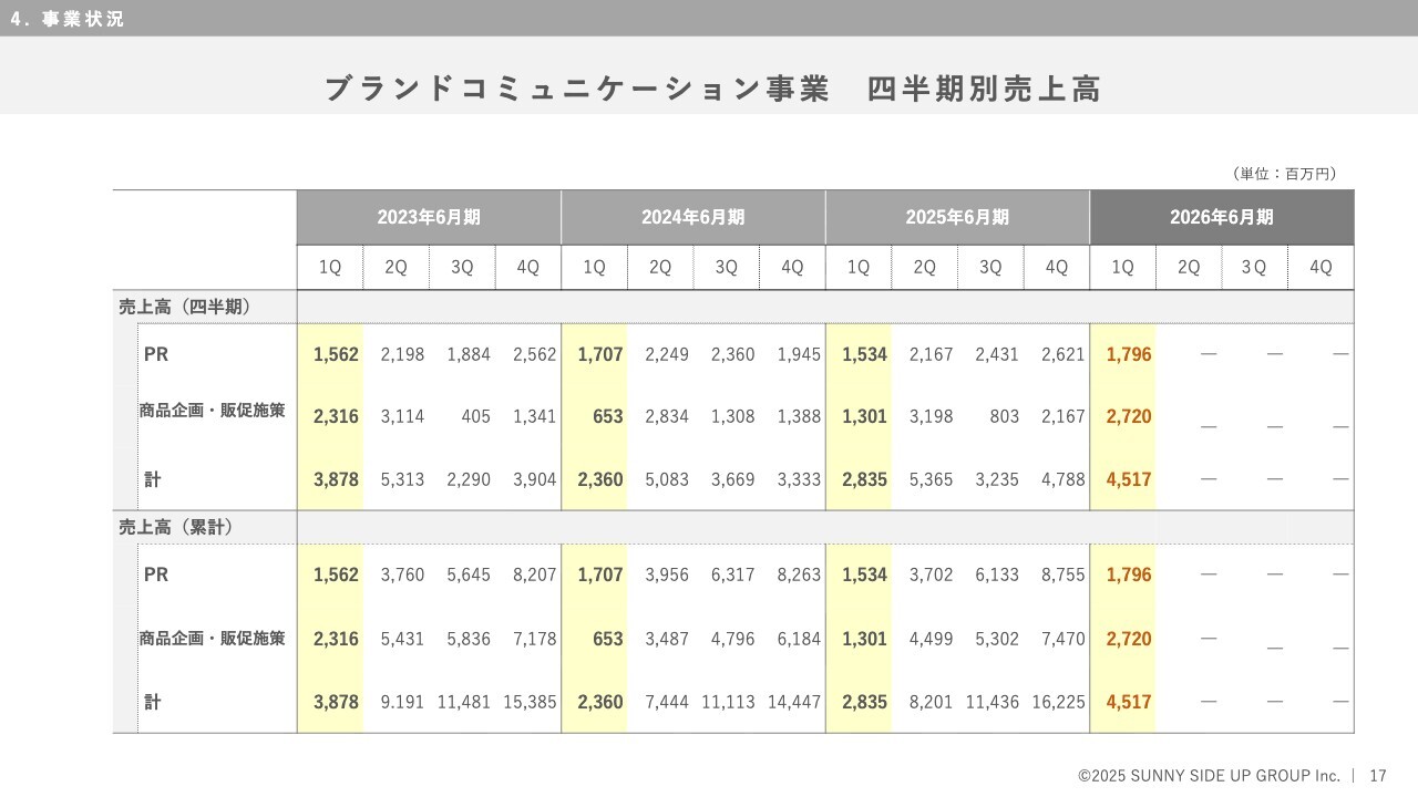 こちらは、ブランドコミュニケーション事業の四半期別売上高をPR、商品企画・販促施策に区分して表示したものです。当第1四半期は、PR、商品企画・販促施策とも伸長しています。
