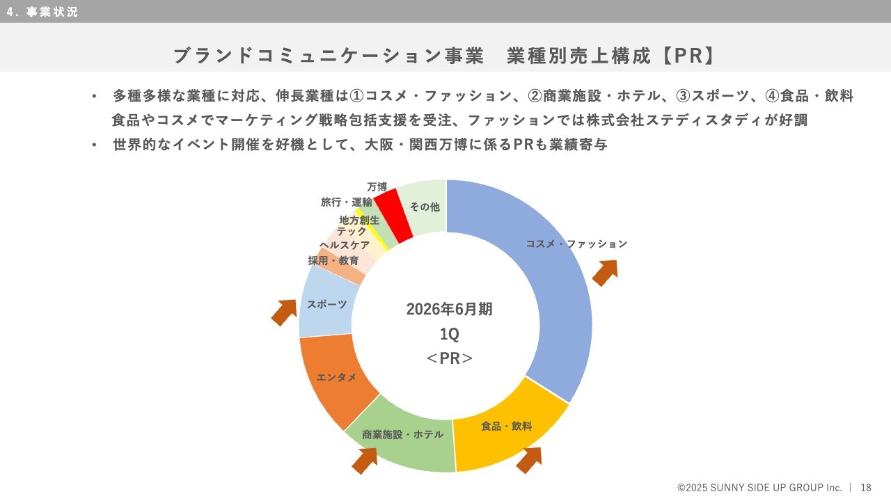 食品やコスメでは、包括的なサービスを提供するマーケティング戦略支援を受注したほか、ファッションでは、前年にオフィスを拡張移転した子会社のステディスタディが好調に推移しました。さらに、世界的なイベント開催が追い風となり、大阪・関西万博関連のPRも業績に寄与しました。