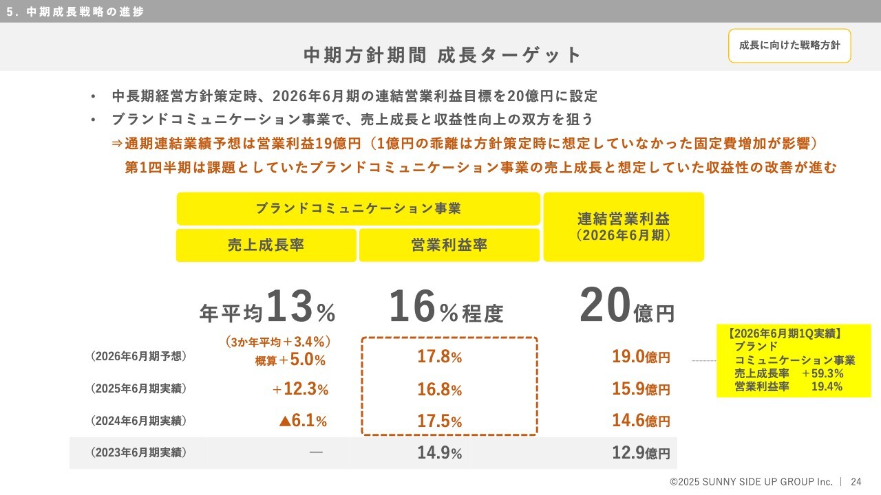 中期方針期間の成長ターゲットです。中長期経営方針の策定時、2026年6月期の連結営業利益目標を20億円、主力のブランドコミュニケーション事業の3年間平均の売上成長率を13パーセント増、営業利益率を16パーセント程度に設定しました。なお、当期営業利益予想は19億円と若干の乖離がありますが、これは主に方針策定時に想定していなかった固定費の増加が影響しています。