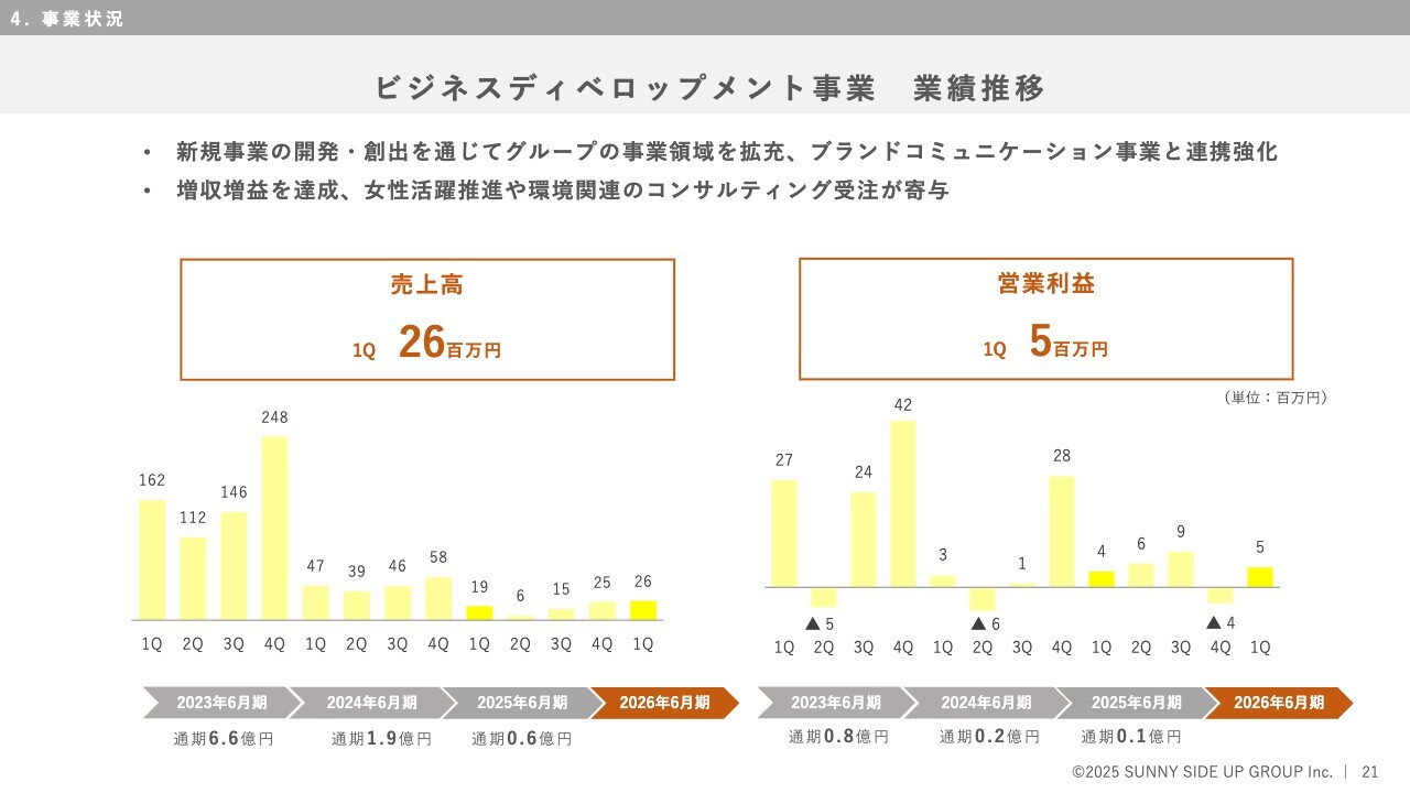 ビジネスディベロップメント事業の業績推移です。グループの事業を拡充する位置づけから、ブランドコミュニケーション事業との連携強化を進めています。当第1四半期は、女性活躍推進や環境関連のコンサルティング受注が寄与し、増収増益となりました。