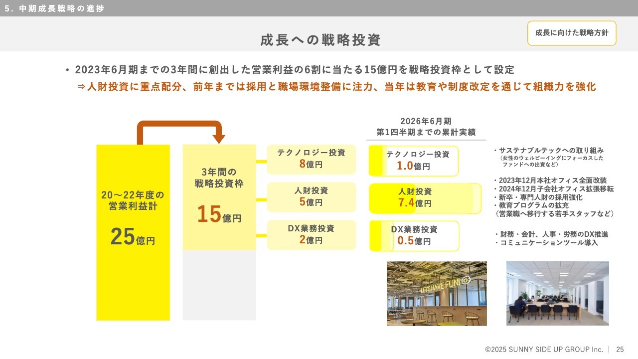 成長に向けた戦略投資です。2023年6月期までの3年間で創出した営業利益の6割にあたる15億円を戦略投資枠として設定し、テクノロジー投資、人財投資、DX業務投資を行うことを計画しました。