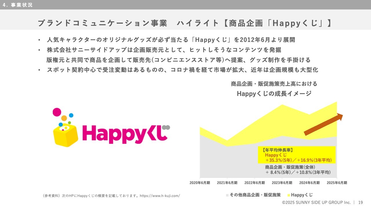 市場規模を算出することが難しいのですが、コロナ禍を経て市場が拡大しており、近年は企画規模も大型化しています。「Happyくじ」の場合、5年平均の売上成長率は35.3パーセント、3年平均でも16.9パーセントと高く、業績に大きく貢献しています。