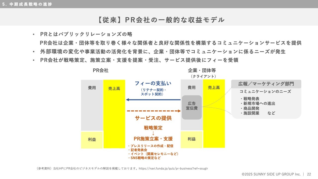 次に、中期成長戦略の進捗についてご説明します。こちらは、PR会社の一般的な収益モデルを示しています。PR会社は、クライアントの広告宣伝費からフィーをいただき、プレスリリースの作成・配信、記者発表会・イベントの開催、SNS戦略の策定などを担当します。一般に、商品開発や施設開業など、企業活動が活発化すると、コミュニケーションに係るニーズが発生します。