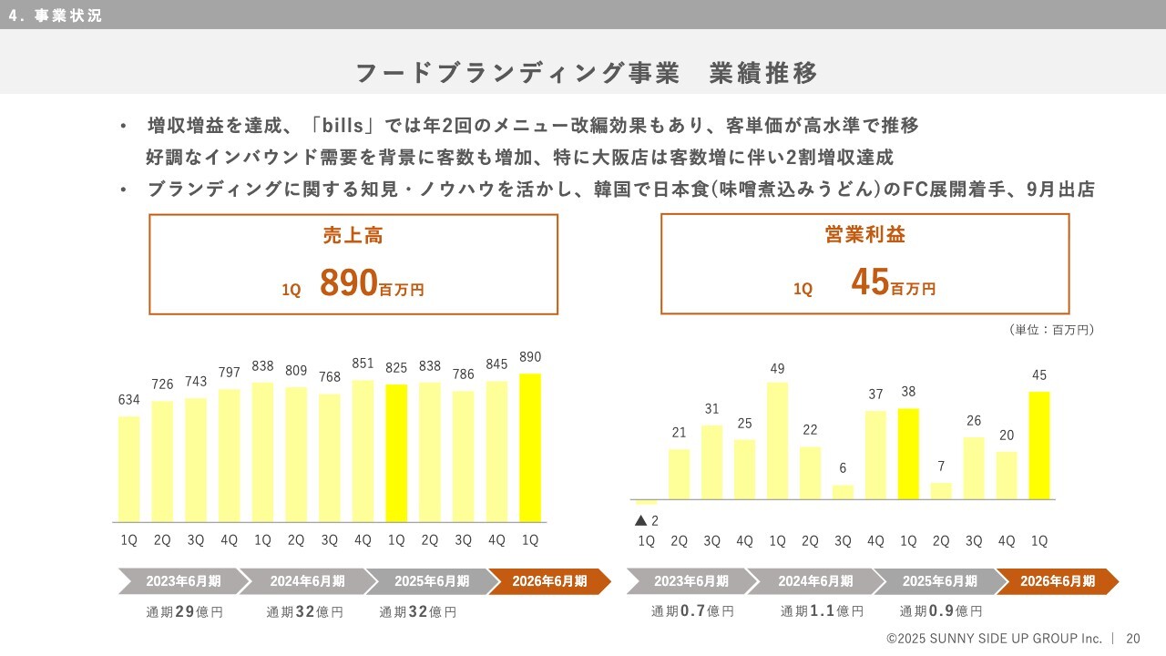 フードブランディング事業の業績推移です。当第1四半期は増収増益を達成しました。「bills」は、年2回のメニュー改編効果もあり、客単価が高水準で推移したほか、好調なインバウンド需要を背景に客数も増加しました。特に大阪店は、大阪・関西万博の影響もあり、2割増収を達成しています。