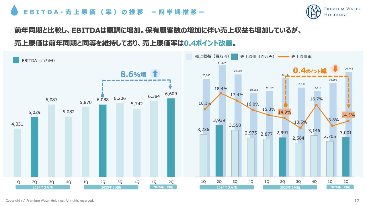 続いて、EBITDAおよび売上原価率の推移についてです。前期のEBITDAは第2四半期で60億8,800万円でしたが、今期は66億900万円となり、8.6パーセント増加しました。