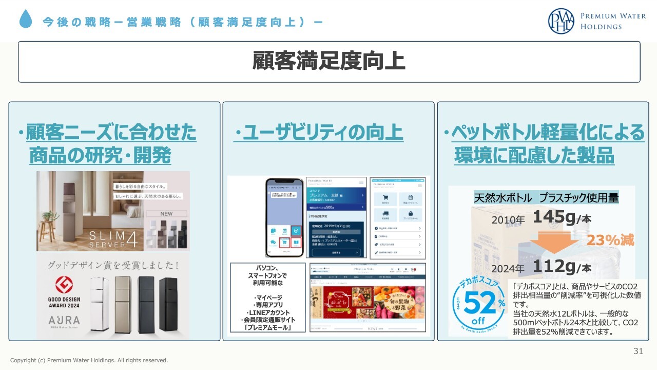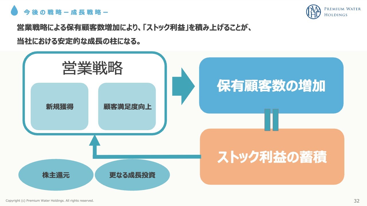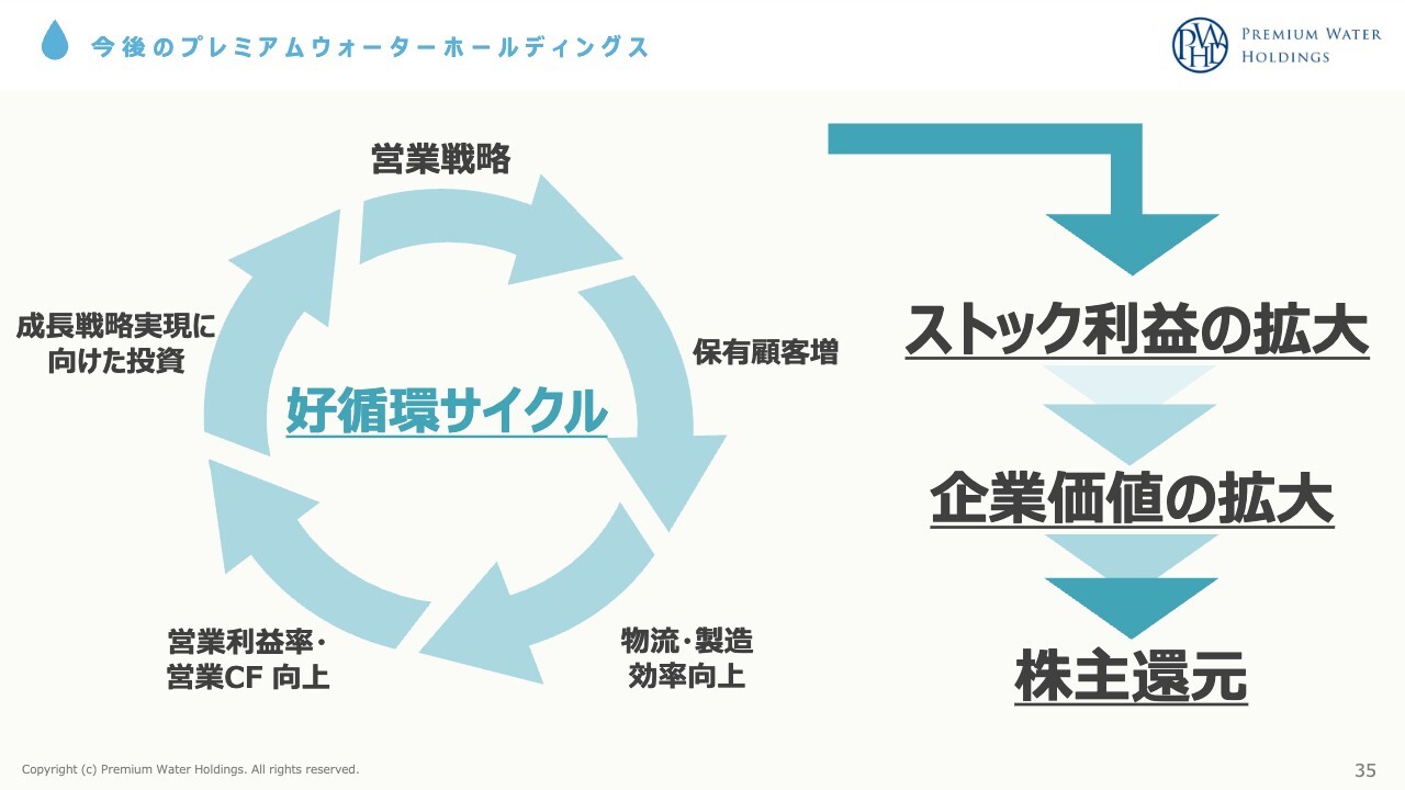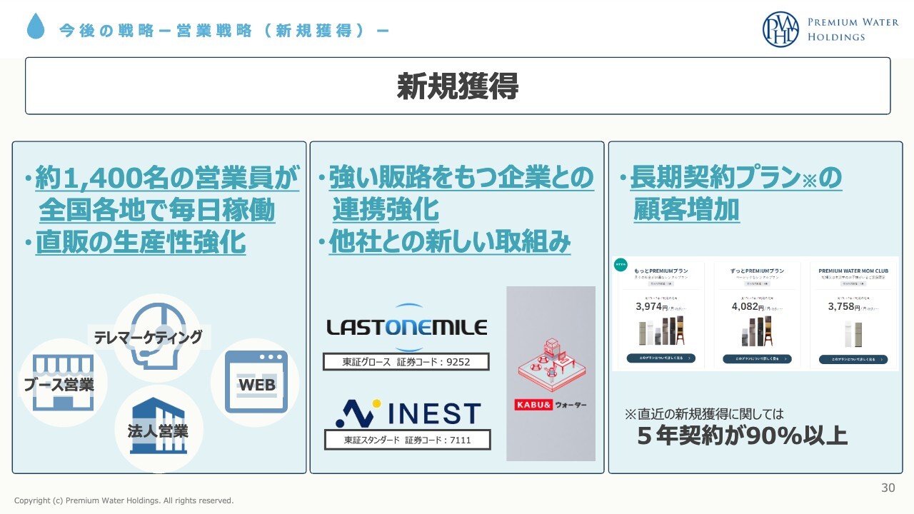 新規獲得の戦略についてですが、全国に約1,400名の営業員が毎日稼働しており、これがプレミアムウォーターホールディングスグループの強みとなっています。この中で直販の生産性を向上させ、そのノウハウを販売店さまにも共有し、さらに強い営業組織を構築していきたいと考えています。