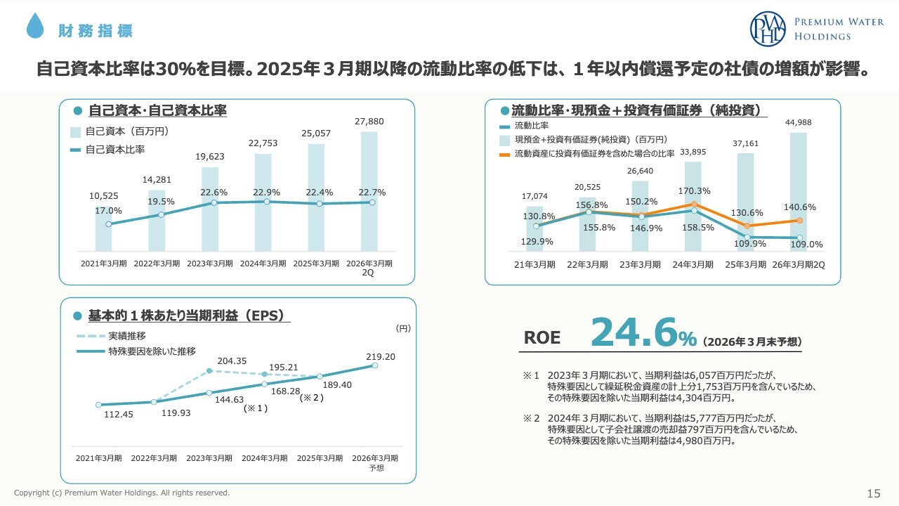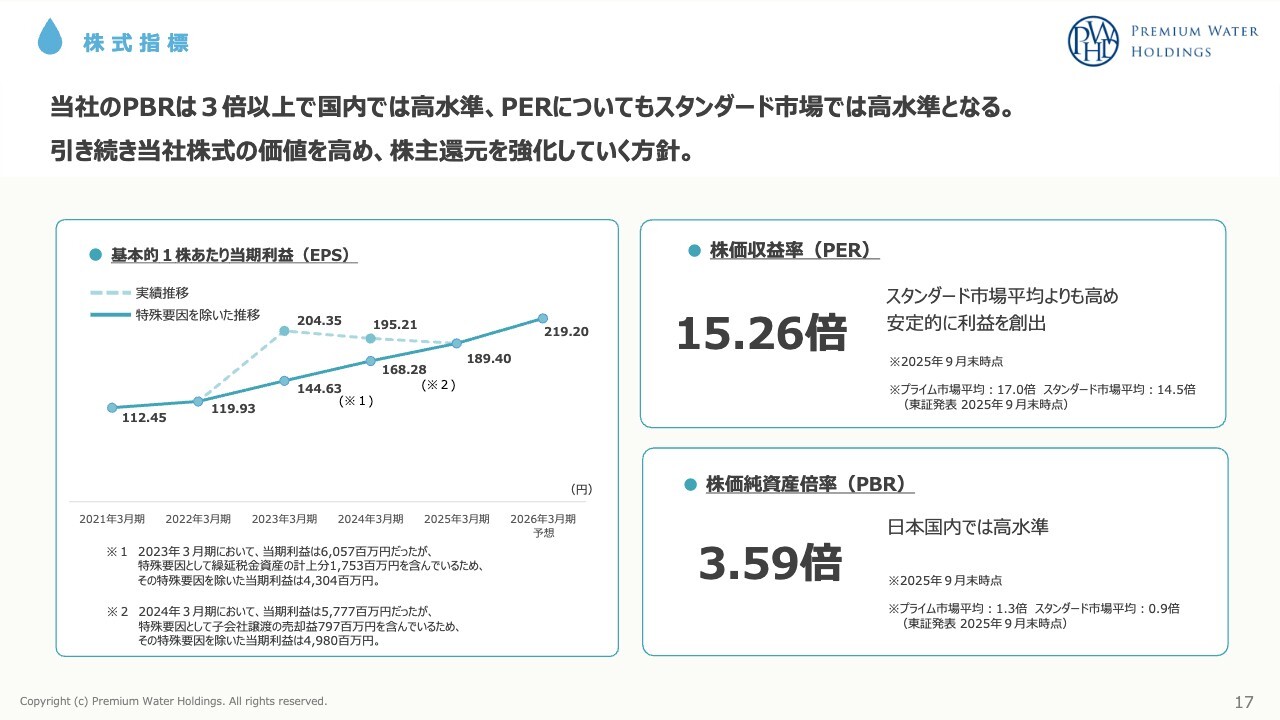 株価収益率(PER)についてです。現状、株価を含めて非常に低いと認識しています。日本の今後の水道水の状況や環境については、この後お伝えしますが、天然水や宅配水に対する需要が今後確実に高まっていくと見込んでいます。そのため、これからが成長期であると考えています。