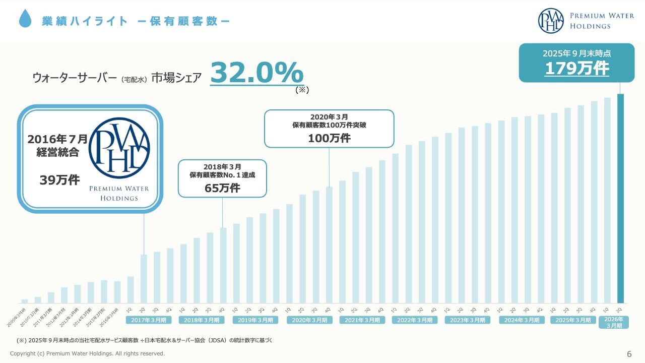 続いて、保有顧客数の推移についてご説明します。2016年7月に経営統合を行い、「プレミアムウォーターホールディングス」が誕生しました。当時のユーザー数は39万件でスタートしました。