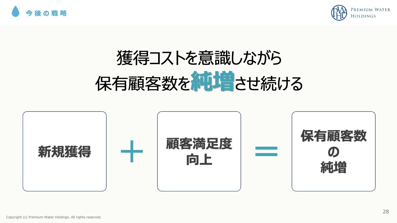 このような社会的な問題を背景に、今後の戦略をしっかりと考えていきたいと思います。その中で、これは当社の最重要課題となりますが、獲得コストを意識しつつ、保有顧客数を純増させ続けていきます。