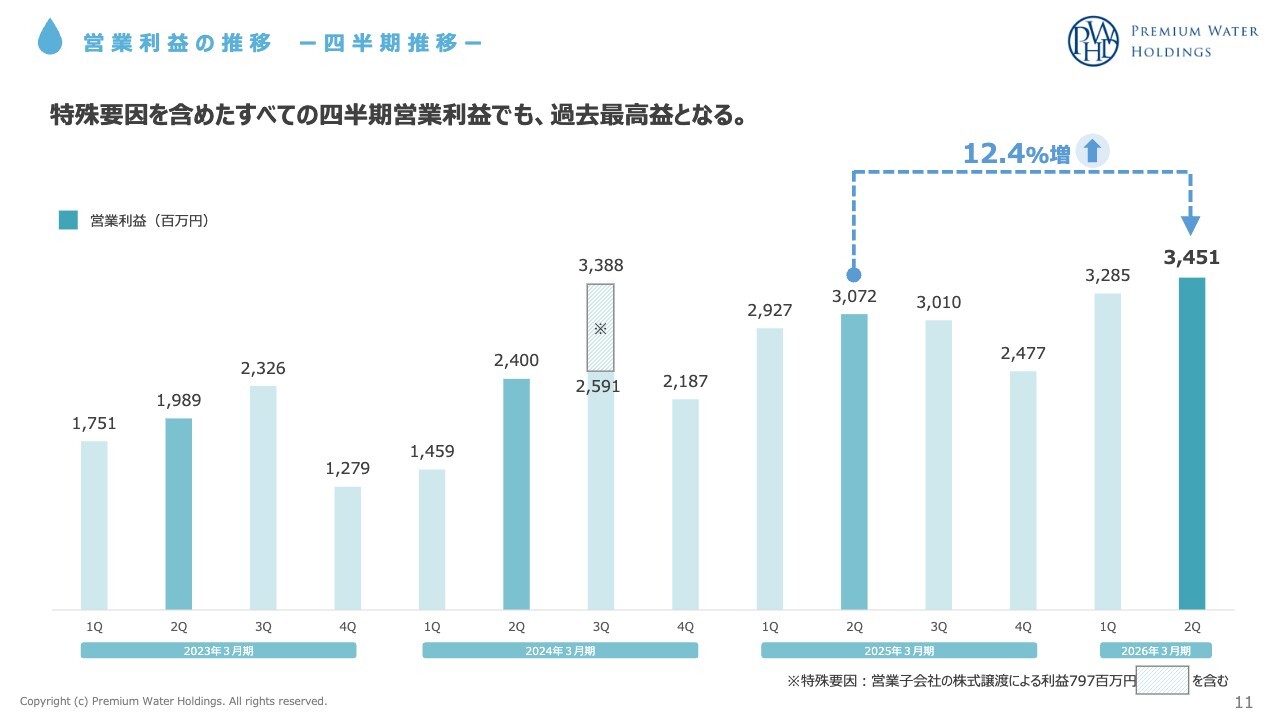過去には特殊要因で利益が増加した四半期もありましたが、それを含めても今期の第2四半期は過去最高益となりました。