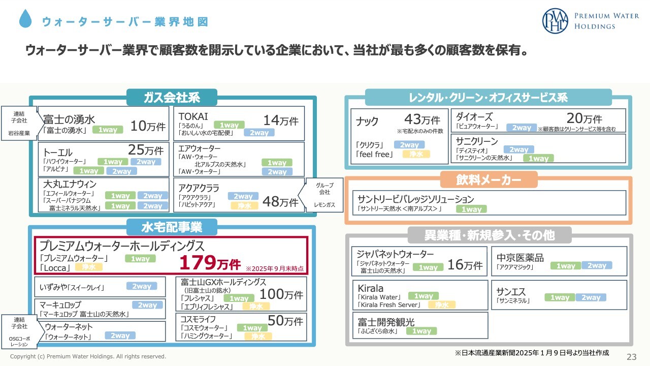 ウォーターサーバーの業界地図についてご説明します。まず、ガス会社系、レンタル・クリーン・オフィスサービス系などがあります。当社は水宅配事業を展開しており、2025年11月18日時点では180万ユーザーを超えています。ここからさらに200万ユーザー、300万ユーザーへとユーザー数をしっかりと拡大し、業界No.1の地位をより確固たるものにしていきたいと考えています。