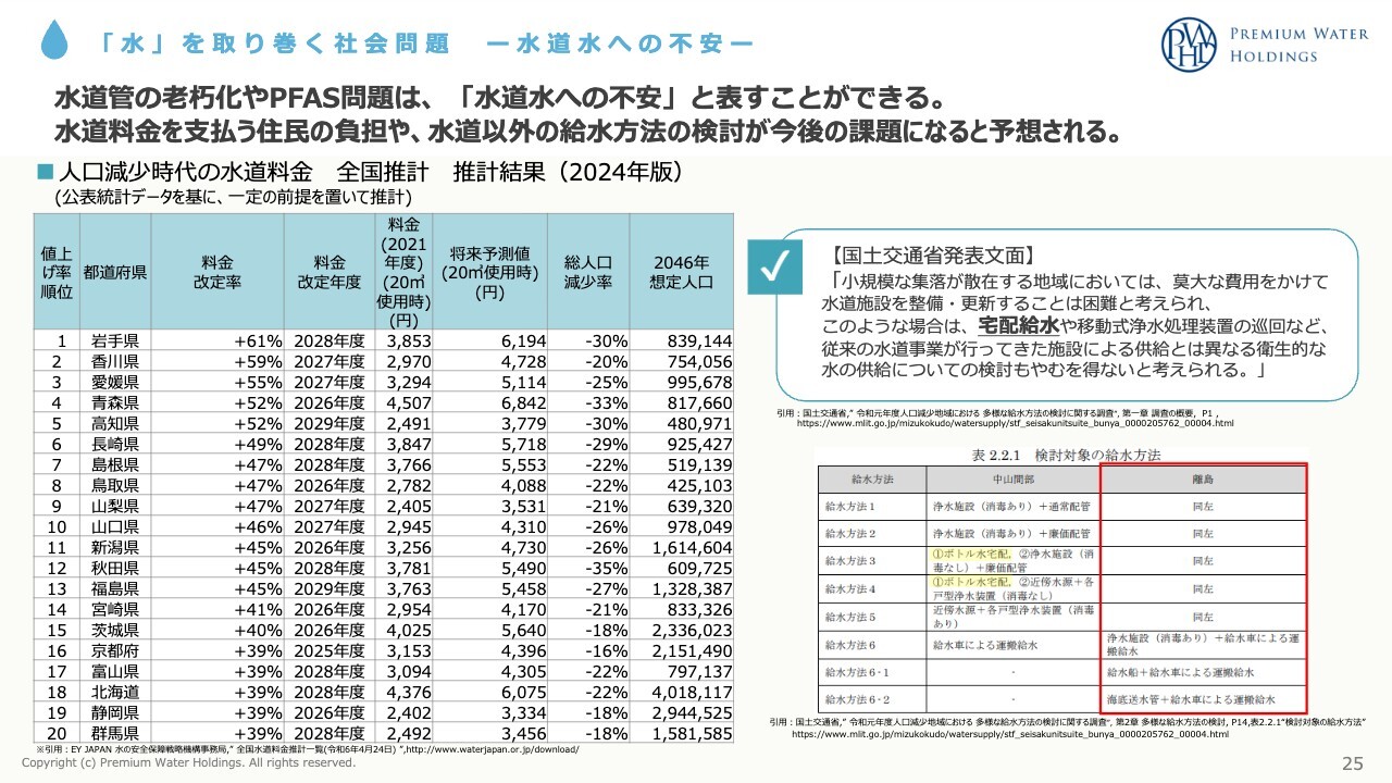このように、エリアによっては水道水自体が供給できない場所が出てくる可能性が高いと言われています。そのため、そのような状況では、天然水や宅配水の必要性、重要性が確実に高まると考えています。