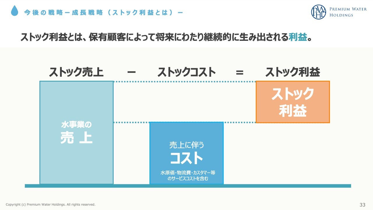 ストック売上は、主に水の売上を指します。ユーザーさまからいただいた水の売上から、その売上に伴う水の原価、物流費、カスタマーサービスなどのサービスコストを差し引いたものがストック利益となります。このストック利益の拡大に、当社は毎年尽力しています。