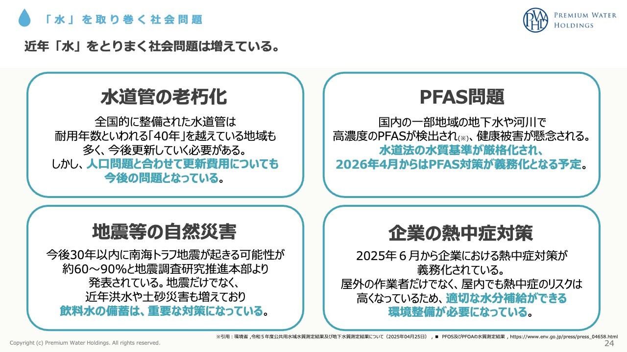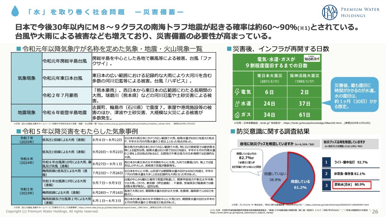 また、地震などの自然災害についてです。南海トラフ地震に関して、発生確率が約60パーセントから90パーセントと予測されており、その際には飲料水の備蓄が重要な対策となることが指摘されています。このような背景から、天然水や宅配水のニーズが今後さらに高まると考えています。