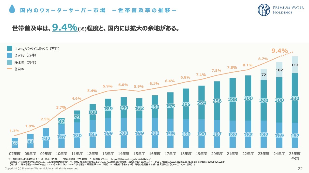 日本における今後の水道水の状況を考慮すると、ウォーターサーバーへのニーズは確実に高まると考えており、この普及率も着実に上昇すると見込んでいます。その中で、確実にシェアを獲得できるよう取り組んでいきたいと考えています。