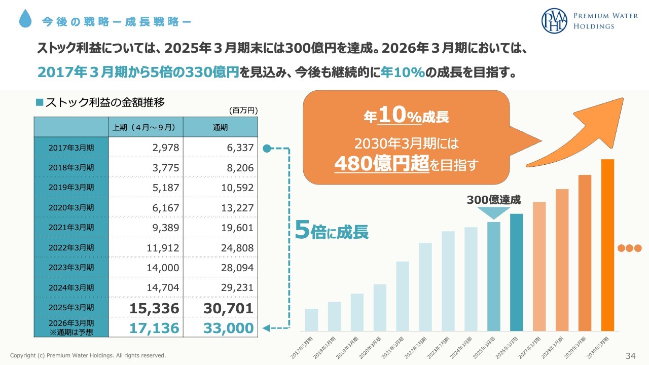 これから、このストック利益を毎年10パーセント成長させていきます。複利方式で毎年10パーセント成長を実現するため、社員一丸となって努力しています。これを達成できれば、2030年3月期には480億円を超えるストック利益を達成することができます。この目標に向かって邁進していきたいと考えています。