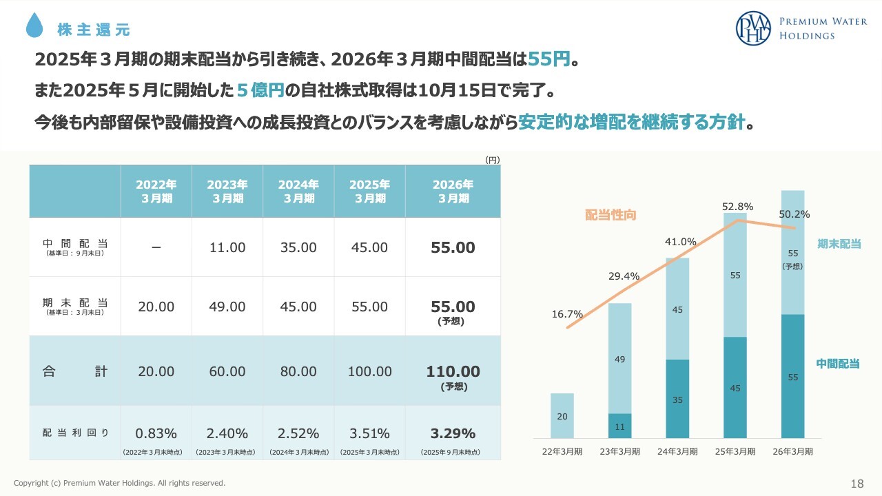 配当性向は50.2パーセントですが、今後も50パーセント前後で推移すると現状では考えています。