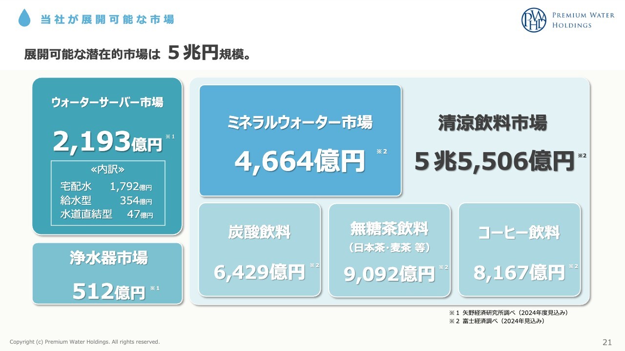 また、水道の蛇口に付ける浄水器市場が512億円、ペットボトルのミネラルウォーター市場が4,664億円です。昨今、ペットボトルの価格が高騰していることもあり、そうしたマーケットも着実に獲得していけるように取り組んでいきたいと考えています。