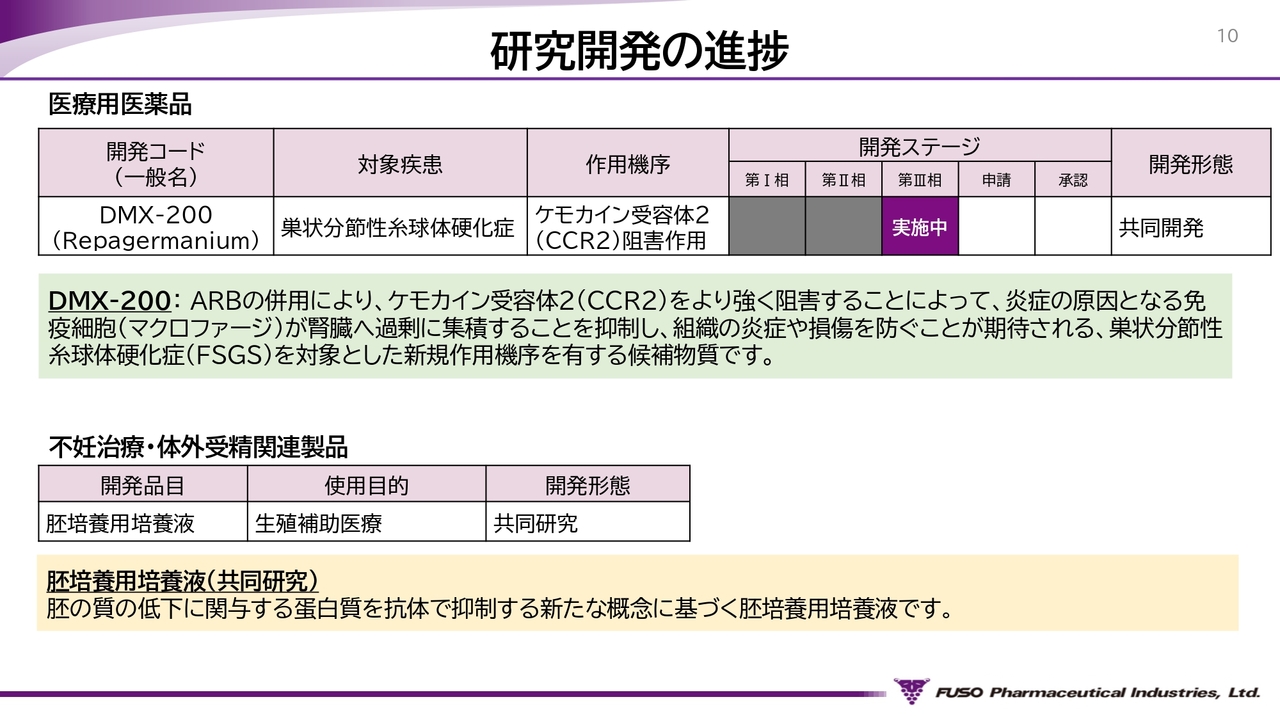 医療用医薬品については、2025年1月に発表したとおり、オーストラリアに本社があるDimerix Limited社が創製したDMX-200についてライセンス契約を締結しました。DMX-200の開発進捗状況については次のスライドにてご説明します。