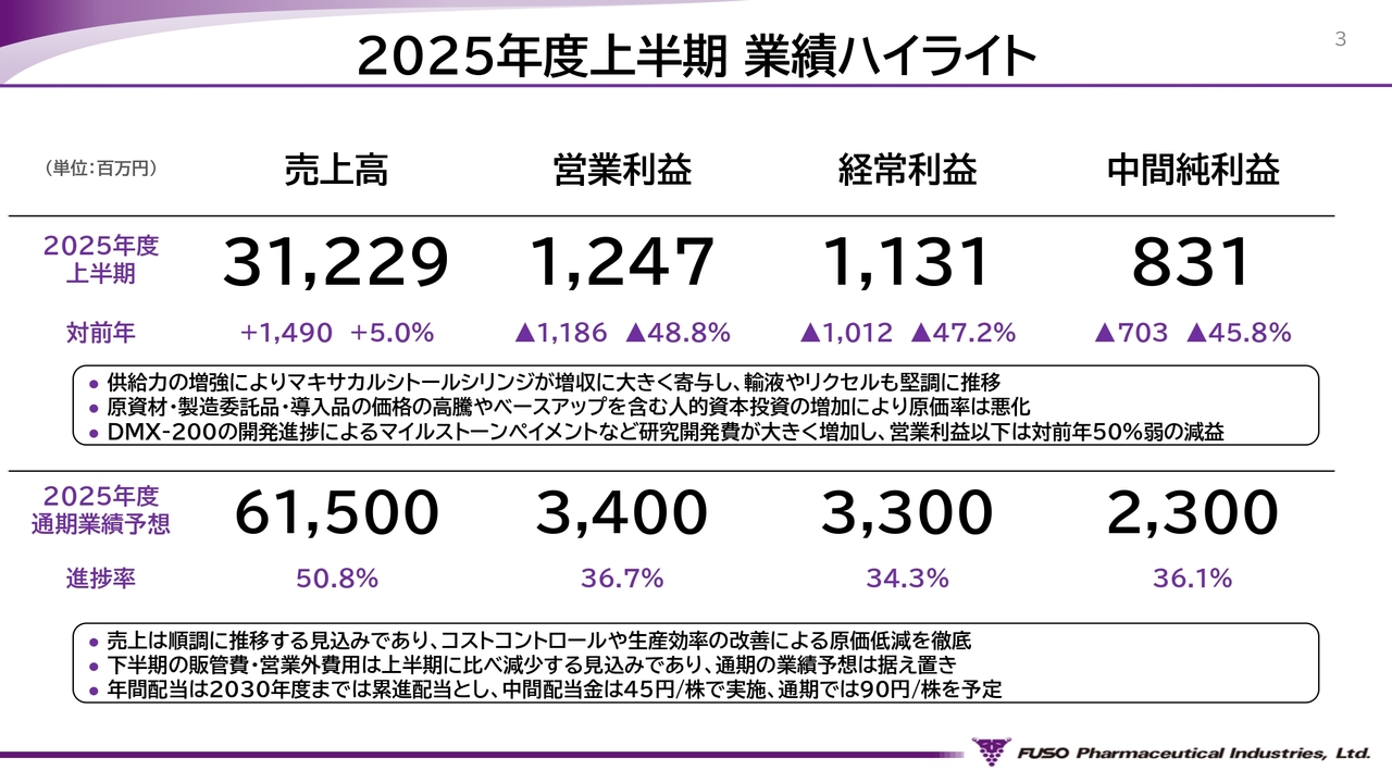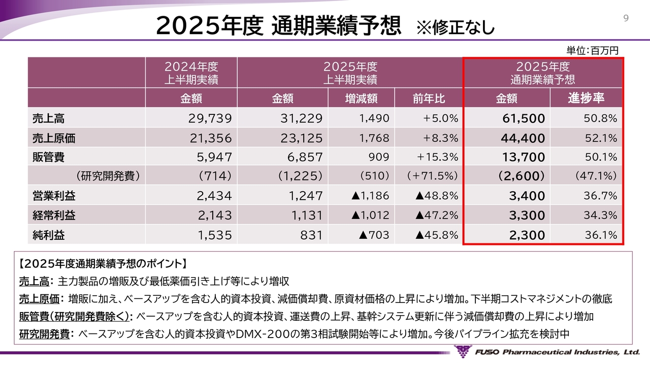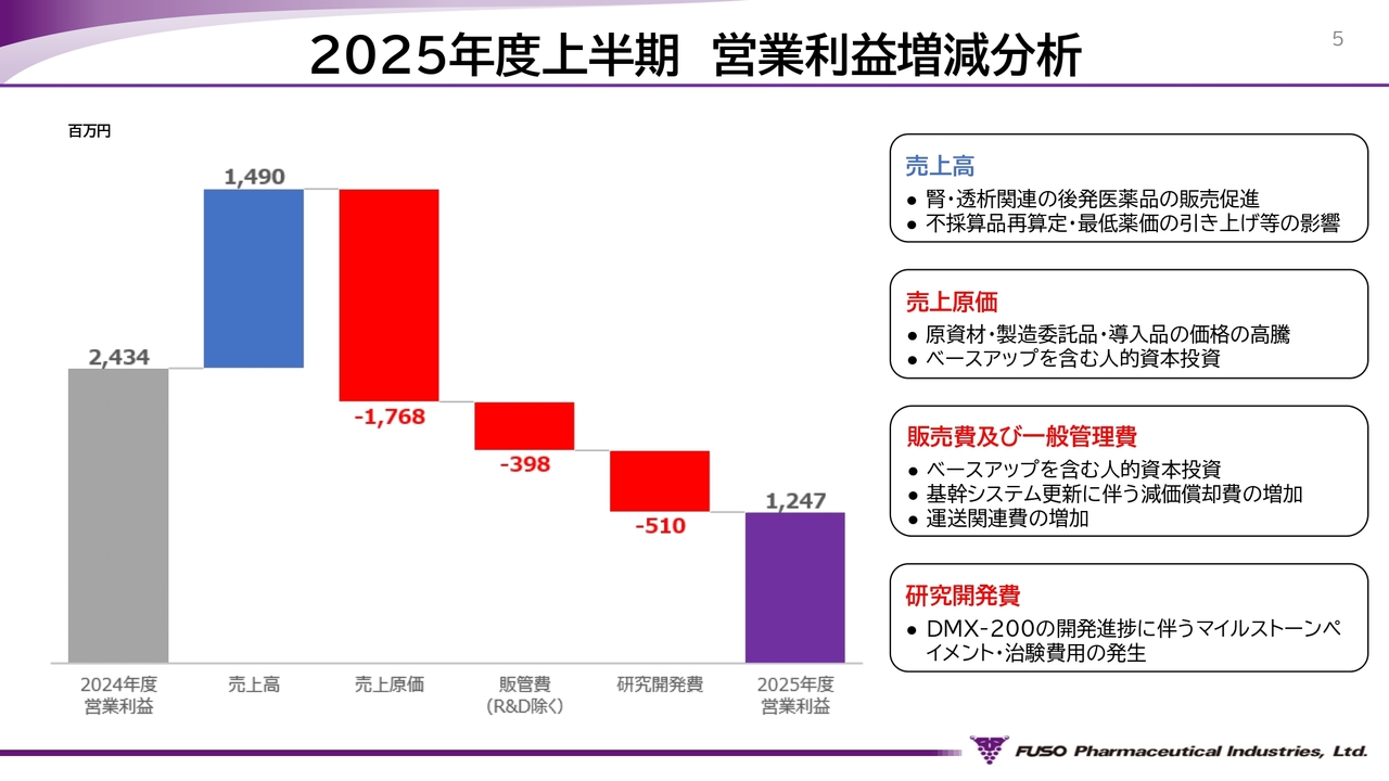 しかしながら、原資材・製造委託品・導入品の価格の高騰やベースアップを含む人的資本投資の増加により原価率が悪化したことや、巣状分節性糸球体硬化症の治療薬候補化合物であるDMX-200の開発進捗によるマイルストーンペイメントなど研究開発費が大きく増加し、営業利益以下は対前年50パーセント弱の減益となりました。