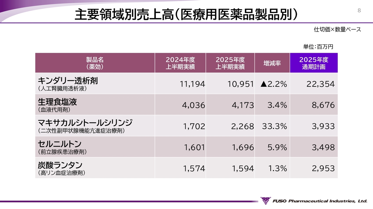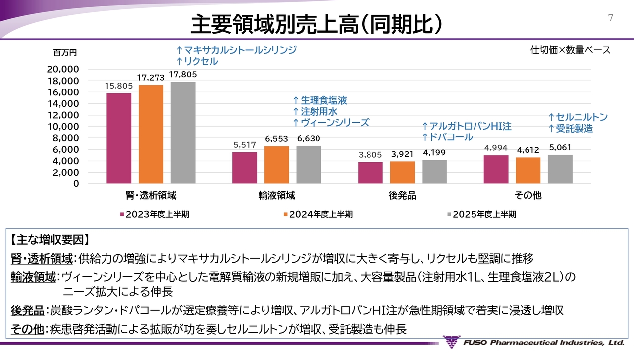 生理食塩液は2リットル製品のニーズ拡大により増収、「マキサカルシトールシリンジ」は供給力の増強により大きく増収となりました。